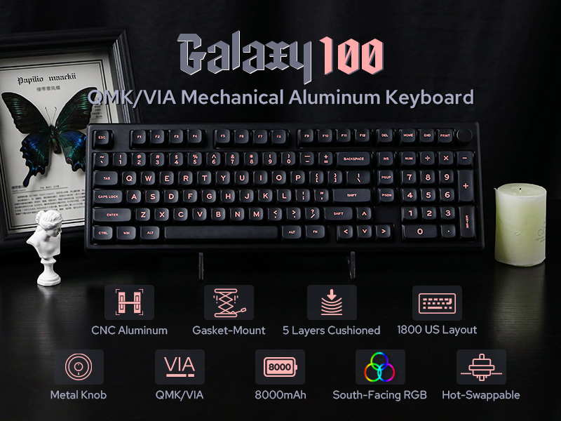 Drawing from the success of Galaxy80 and Galaxy70, the EPOMAKER Galaxy100 QMK keyboard joins the Galaxy Aluminum Keyboard series with new functionality and upgrades. Featuring a gasket-mounted structure, high-quality lubed linear switches, and 5 soft cushioning layers, the Galaxy100 keyboard provides a uniquely satisfying, creamy typing sound.Note: QMK supports working in wired mode.