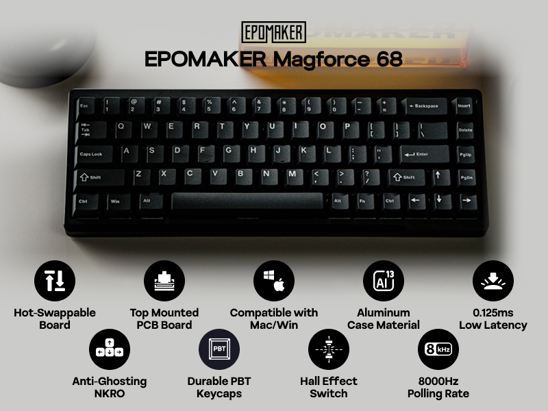 The Epomaker Magforce 68 gaming keyboard features a compact 65% layout that maximizes desk space without compromising functionality.