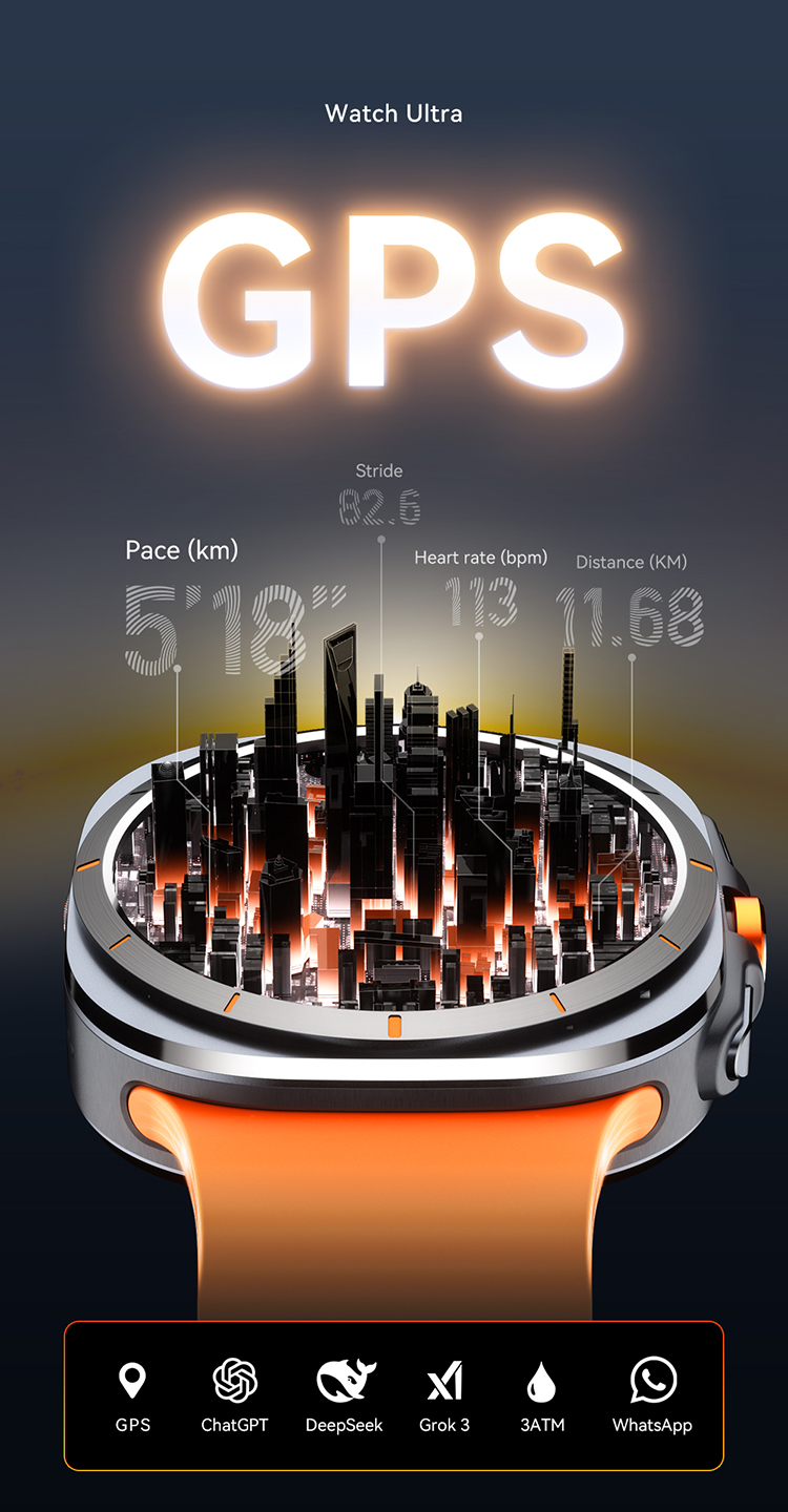Independent GPS, 3ATM Waterproof, photo image synchronization, noise, translation, pinch-finger answer, Offline voice assistant, ChatGPT, WhatsApp reply, AI smart dial production, Equipped with ChatGPT, Deepseek, Grok.