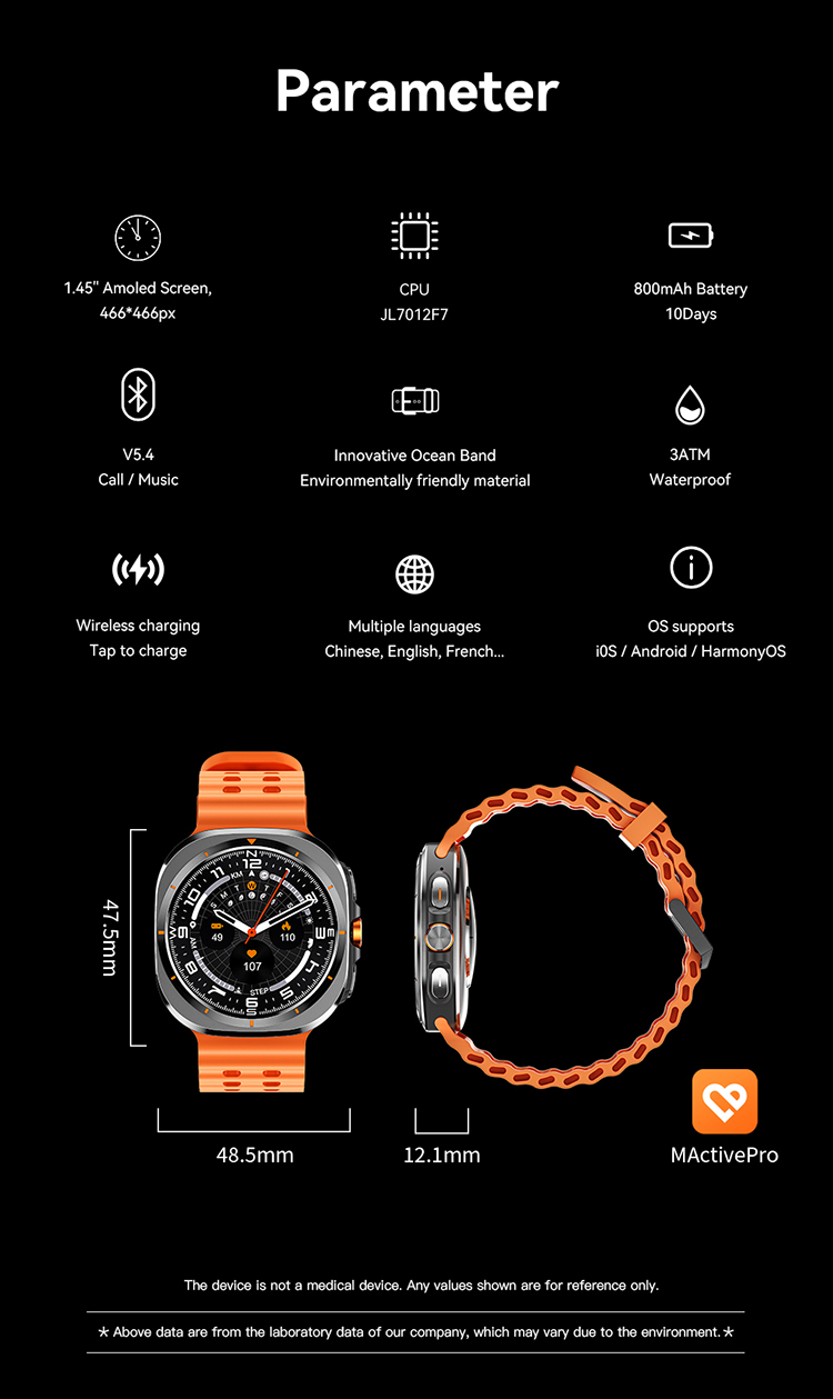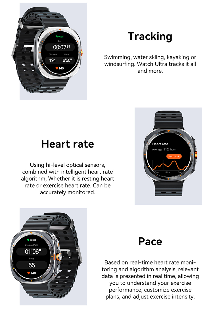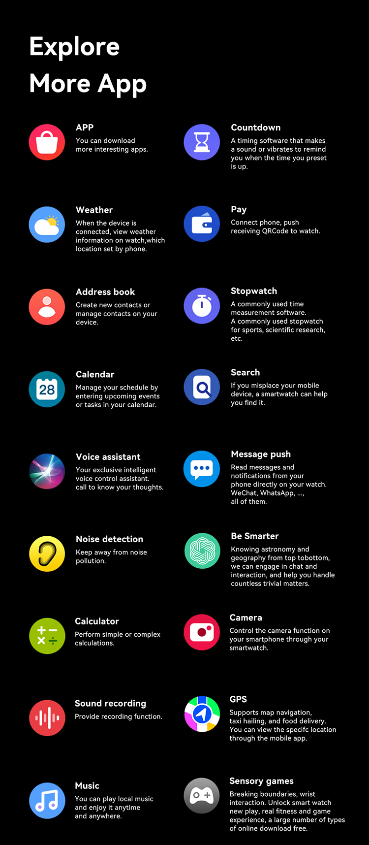 Functions: Independent GPS, 3ATM Waterproof, photo image synchronization, noise, translation, pinch-finger answer, Offline voice assistant, ChatGPT, WhatsApp reply, AI smart dial production, Equipped with ChatGPT, Deepseek, Grok.500+ dial free download, Smart Island, one-click connection, local music playback(can be connected to bluetooth headphones to play), album, e-book, recording, main menu bottom map push, music playback interface bottom map push, motion sensing games, GPS movement, game download, background management, APP skin function, APP movement track video, healthy family sharing positioning health information,SOS alarm, video custom dial push. Wireless charging, Bluetooth call, IP68 waterproof, voice assistant,NFC access control, independent ringtone, independent clock, long bright screen, bedside lamp, female physiology, blood glucose temperature heart rate ECG blood pressure blood oxygen sleep, step counting, Bluetooth photography, Bluetooth music, friends, payment code, computer, contact person, weather, stopwatch, timing, alarm clock, password lock, flashlight.