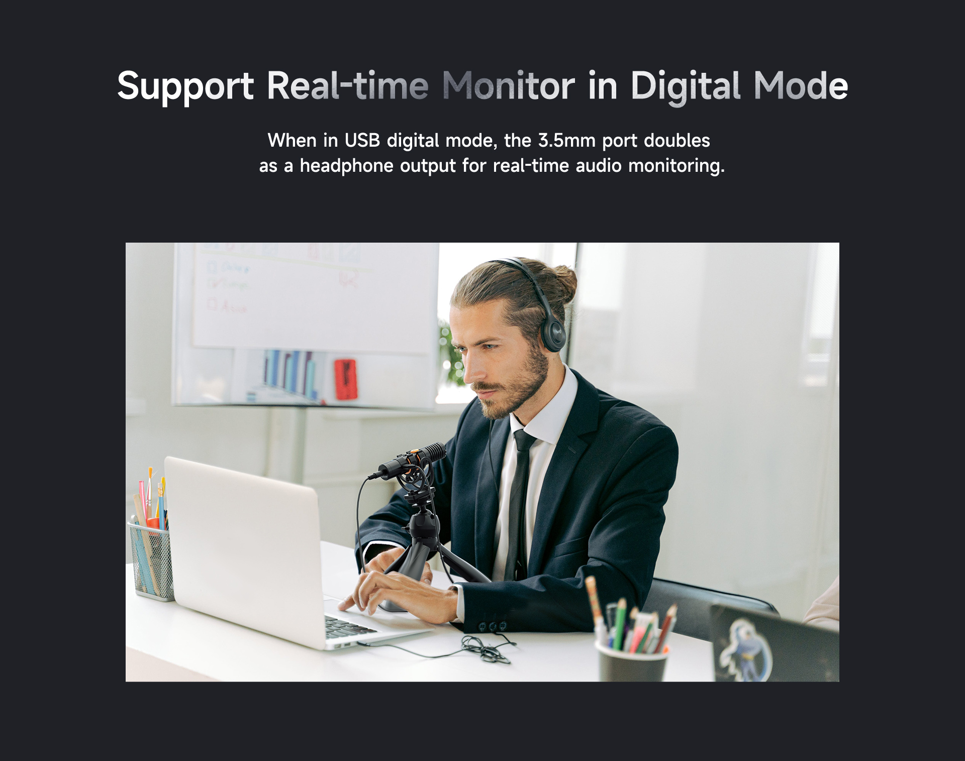 Special FeatureBattery free Mic, Real-time monitoring, Stepless gain control, USB C Digital Output