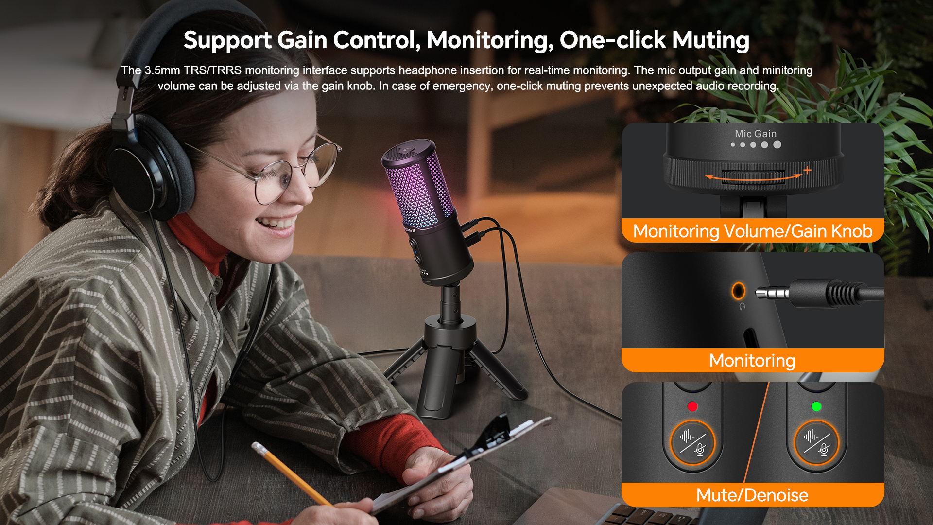 • 【Support Gain Control, Monitoring, One-click Muting】The 3.5mm TRS/TRRS monitoring interface supports headphone insertion for real-time monitoring. The mic output gain and monitoring volume can be adjusted via the gain knob. In case of emergency, one-click muting prevents unexpected audio recording.