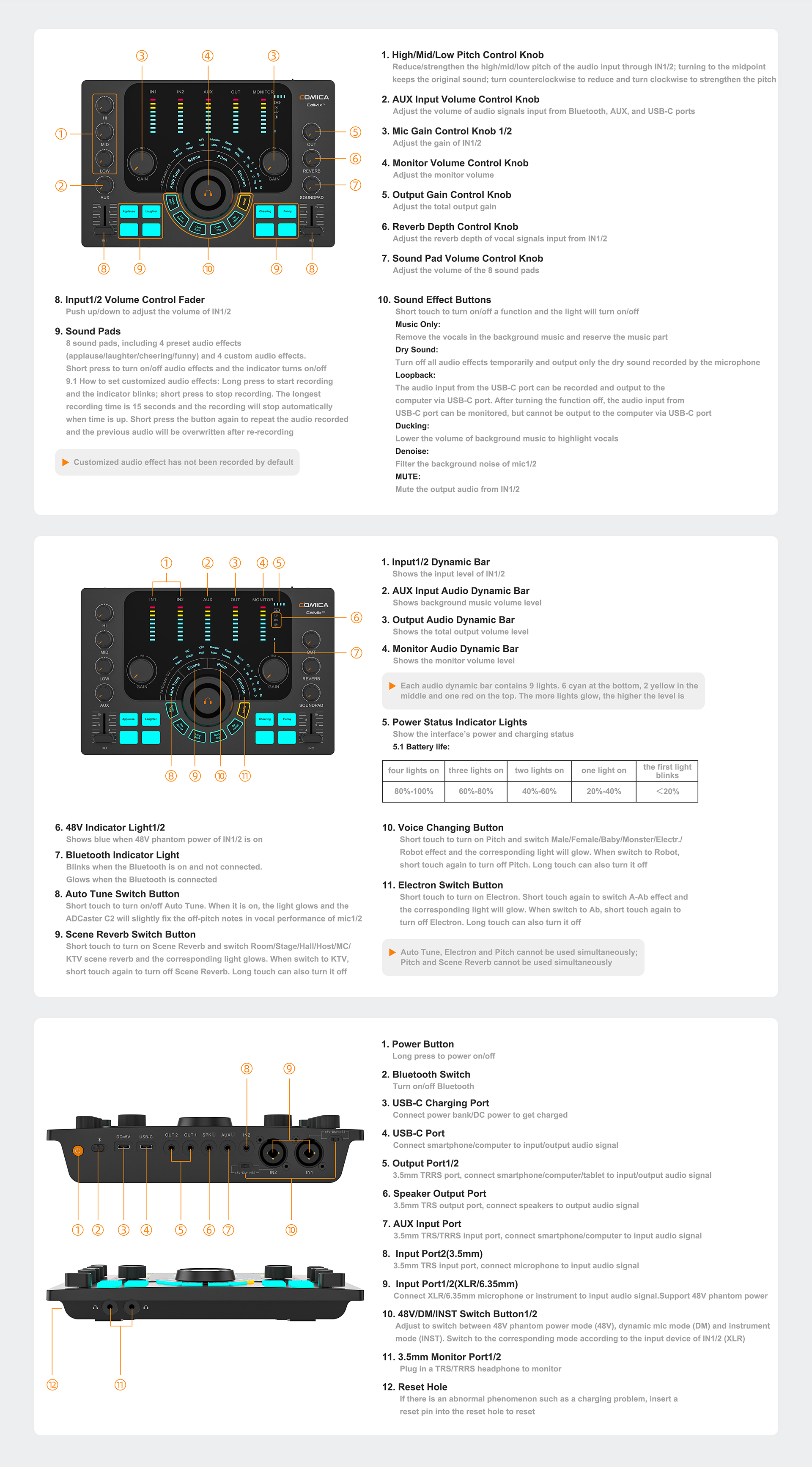 3. Integrated XLR/6.35mm/3.5mm Interface, Support 48V Mic and Instrument Input