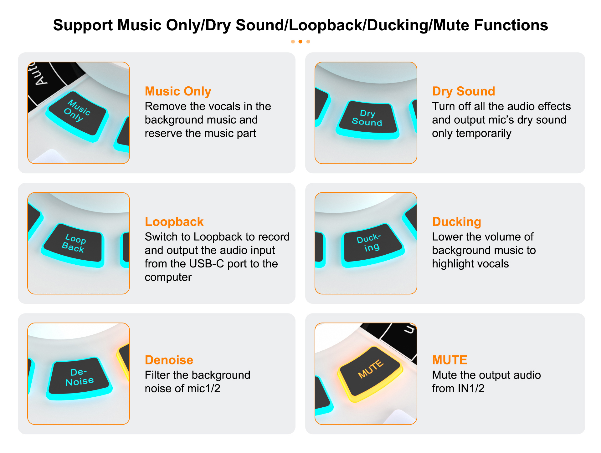 10. Support Music Only/Dry Sound/Loopback/Ducking/Mute Functions