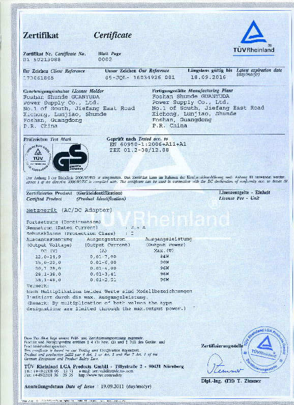 TUV Certificate for AC/DC Adapter