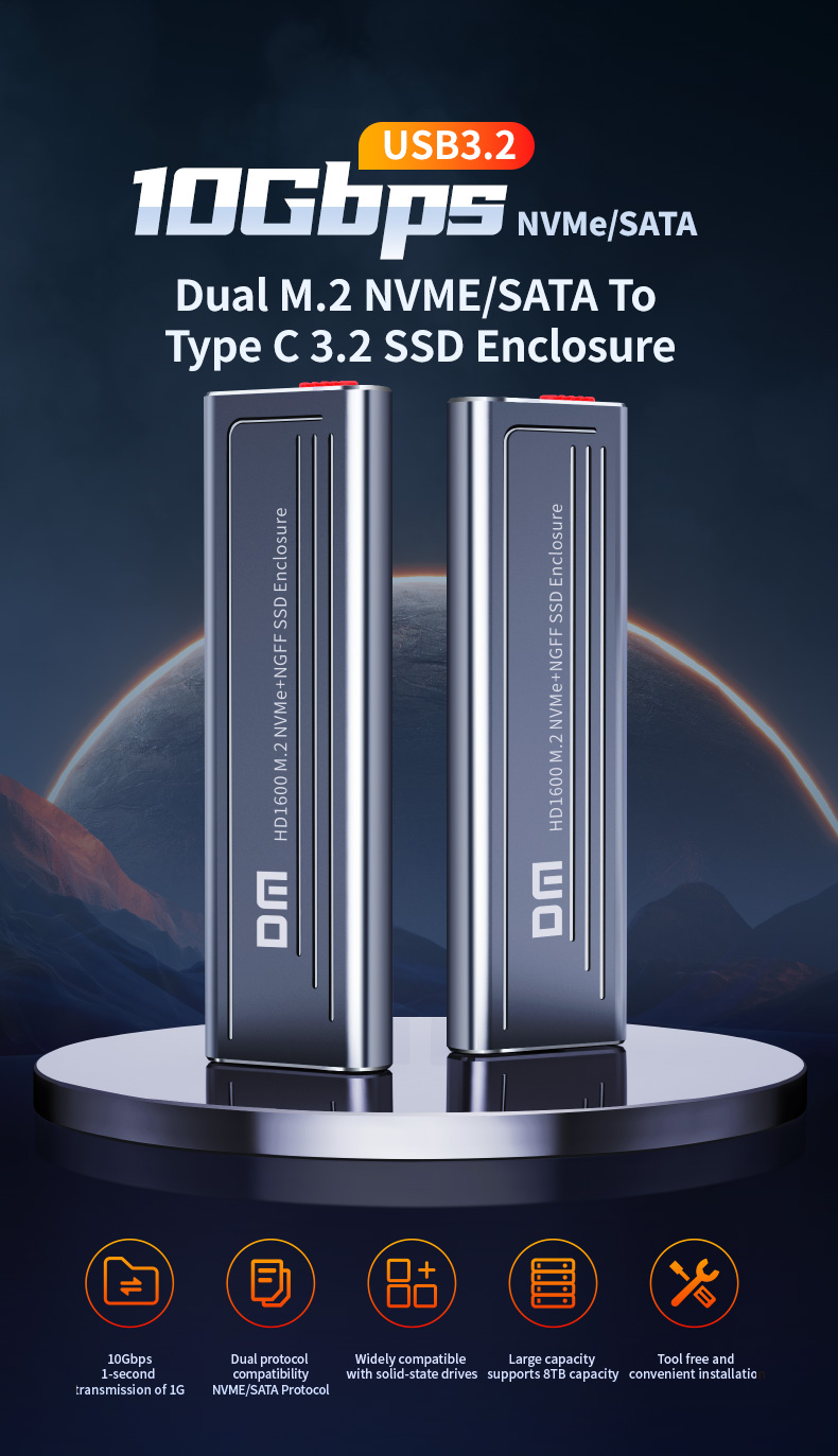DM M.2 NVME/NGFF Dual Protocol SSD Type-C Converter Adapter Enclosure Case Solid State Hard Disk Box HD1600
