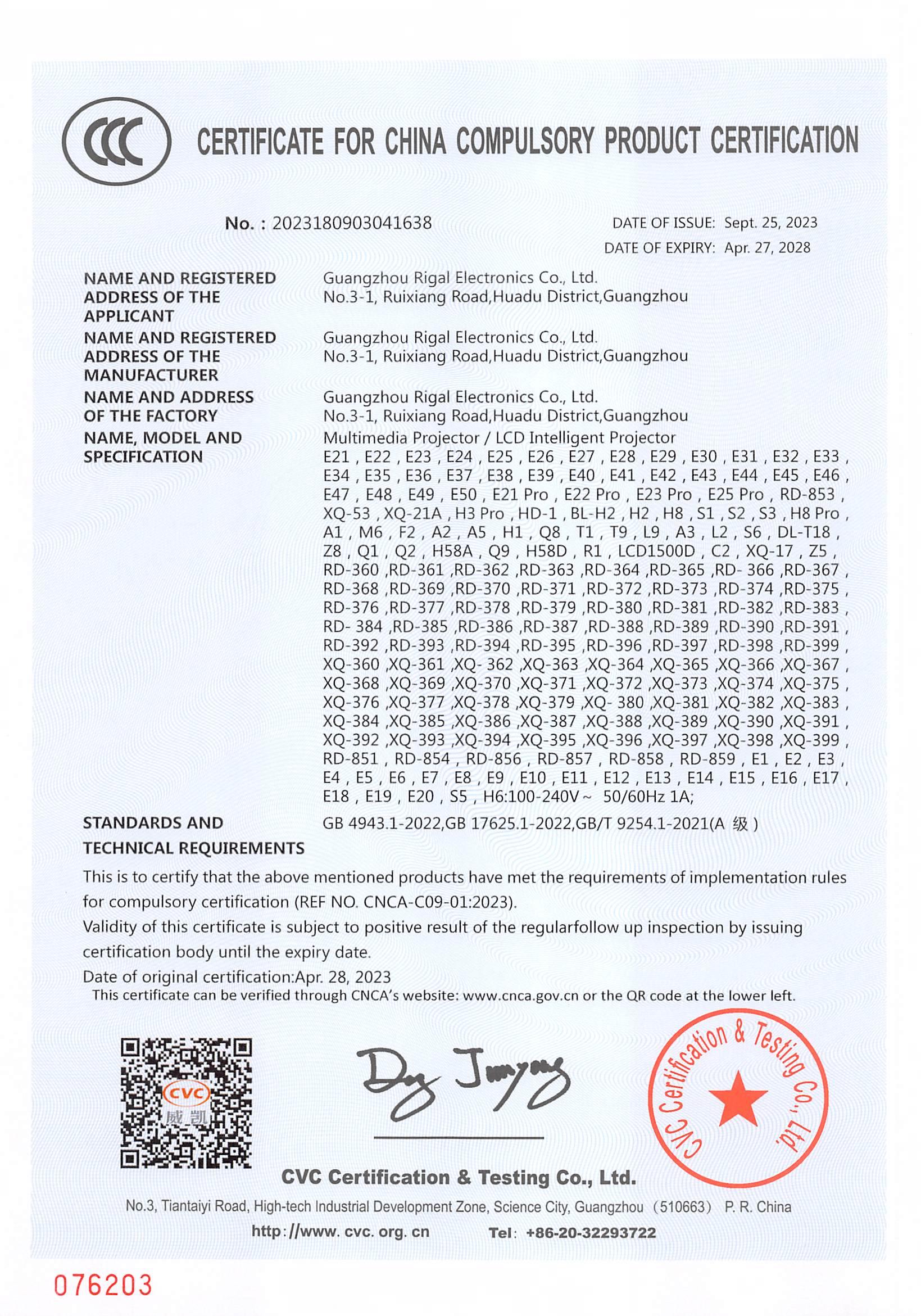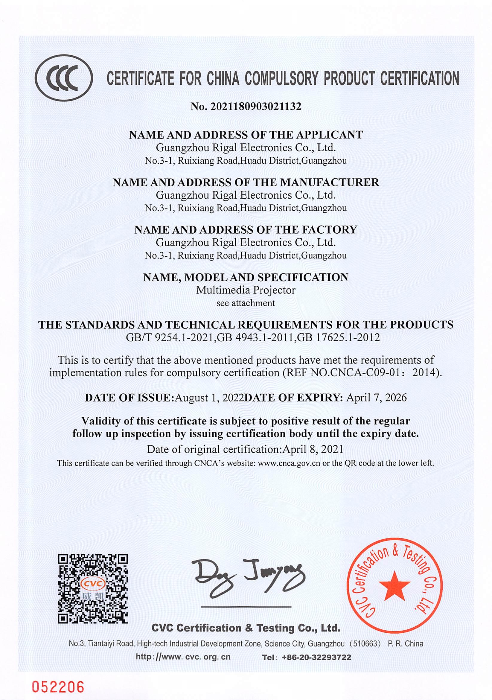 CERTIFICATE FOR CHINA COMPULSORY PRODUCT CERTIFICATION