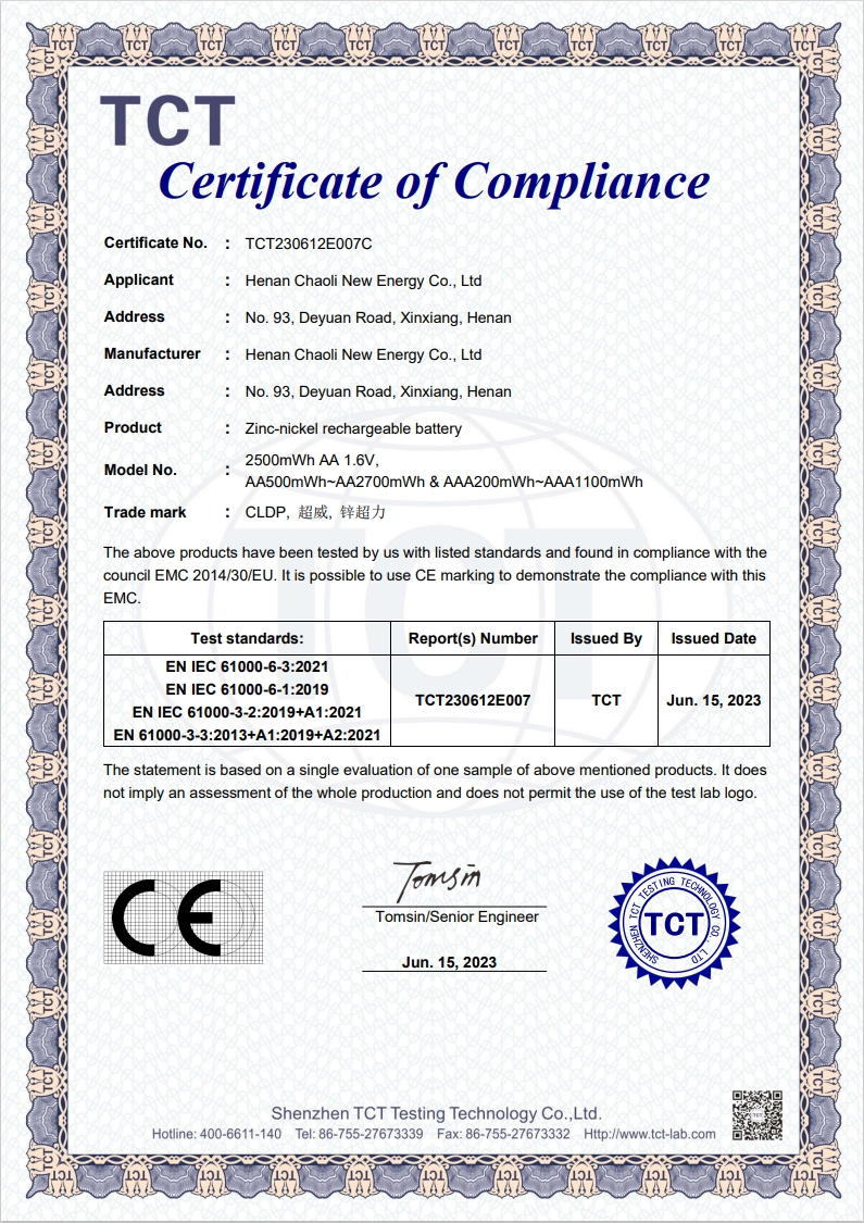 Type | 1.6V Zn-Ni AAA rechargeable batteries | |||