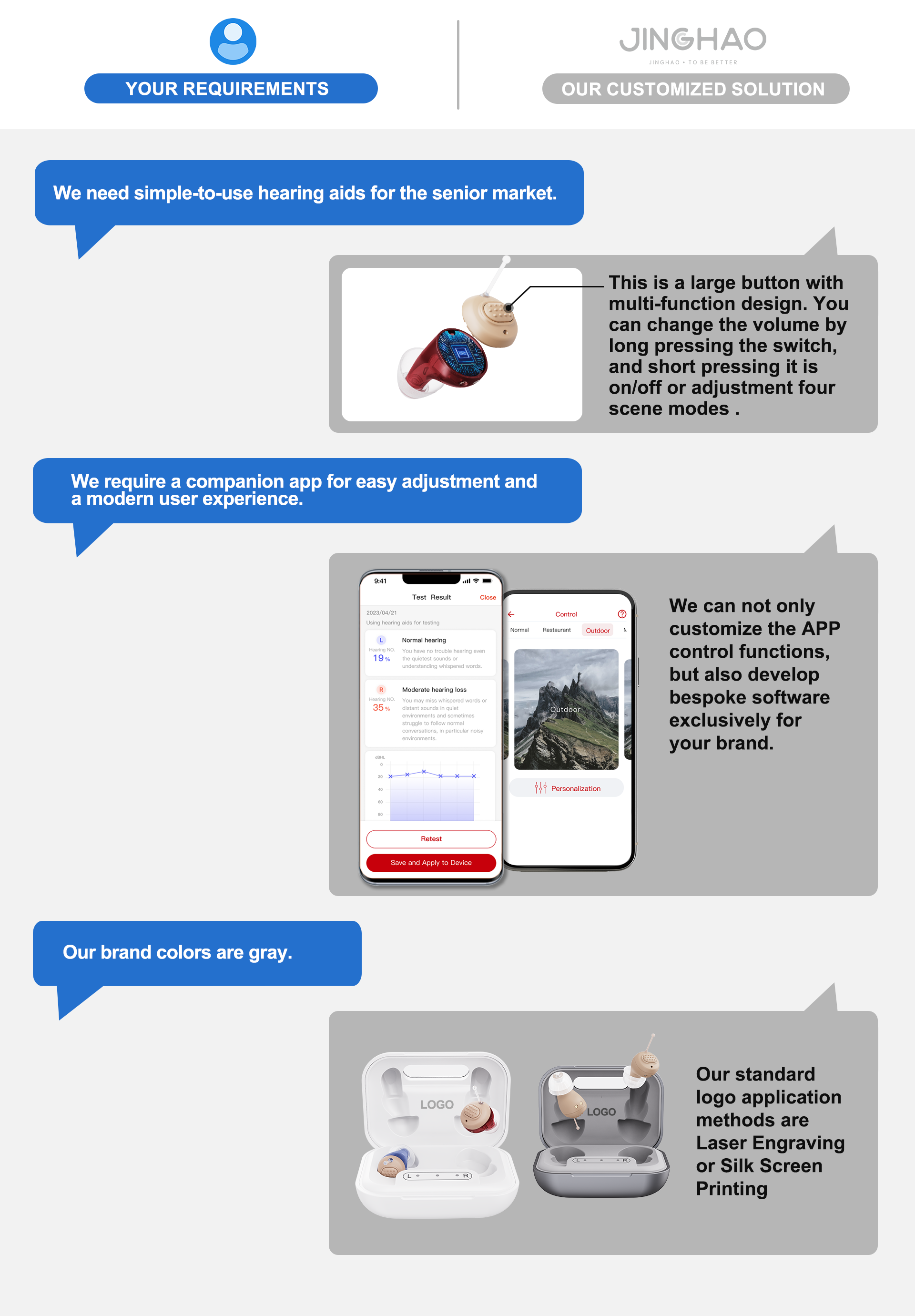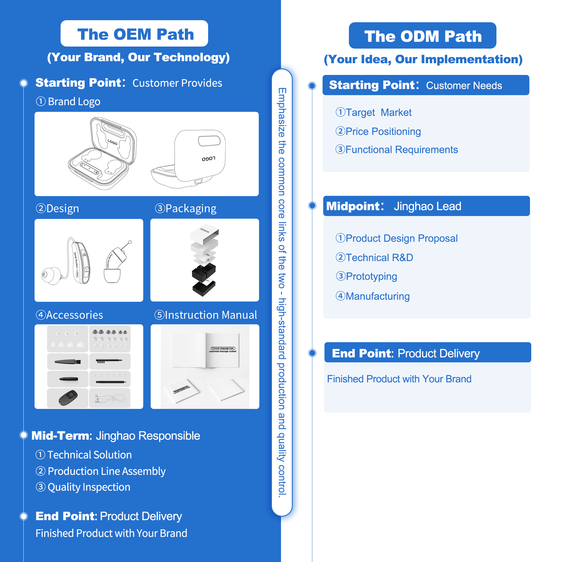 Looking for a reliable hearing aids manufacturer to bring your brand to life? Jinghao Medical is a trusted OEM & ODM partner for global brands. We offer extensive custom hearing aid solutions, from private label manufacturing to complete product development. Our expertise ensures that every device, including models like this one, can be tailored to your specific market needs and hearing technology requirements. Explore our OEM&ODM capabilities below to see how we can help you build a successful hearing product line.