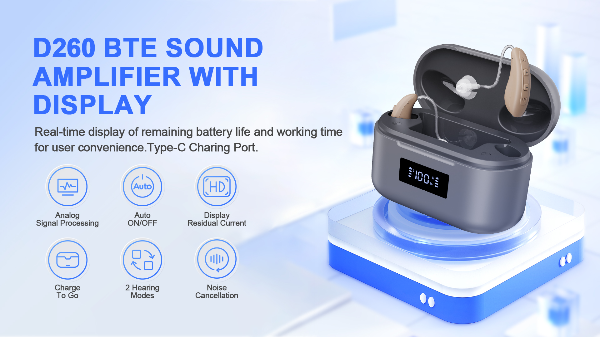 JH-D260 Is a behind-the-ear analog hearing aids with battery display designed for reliable performance and user convenience. Featuring a clear battery indicator display, this device provides real-time power level monitoring for uninterrupted usage.The innovative auto on/off function automatically activates when worn and powers down when removed, ensuring optimal energy efficiency and hassle-free operation. This eliminates the need for manual controls, making it ideal for users seeking simplicity and convenience.