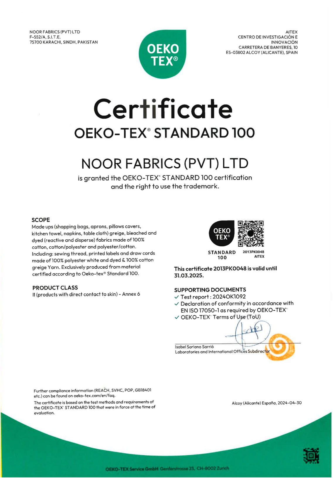 The product is Oeko-Tex 100 certified. The back pack is made with 100% cotton canvas fabrics with its size being 38cm x 50cm and the closure of the bag is with drawstring.