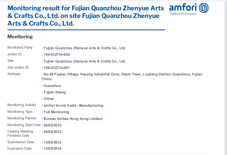 Monitoring result for Fujian Quanzhou Zhenyue Arts & Crafts Co., Ltd. on site Fujian Quanzhou Zhenyu