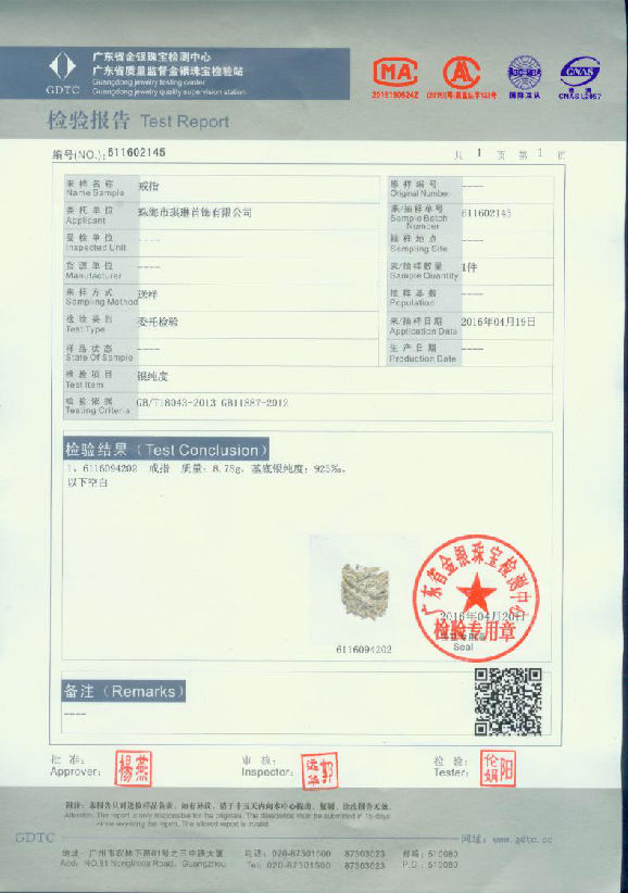 925 sterling silver test report