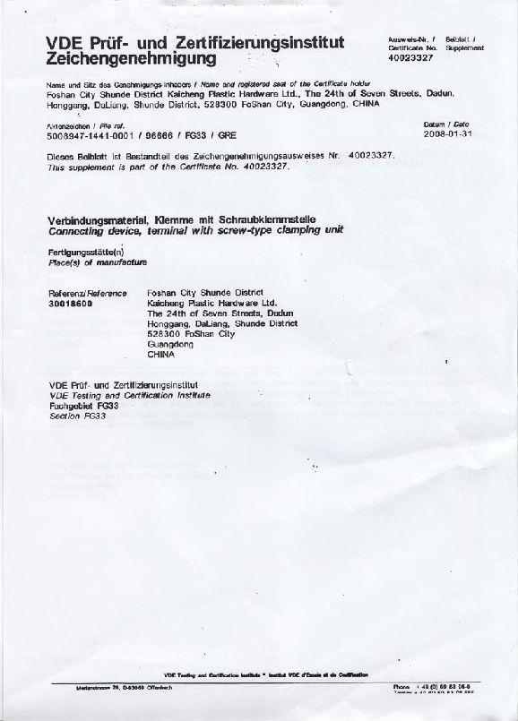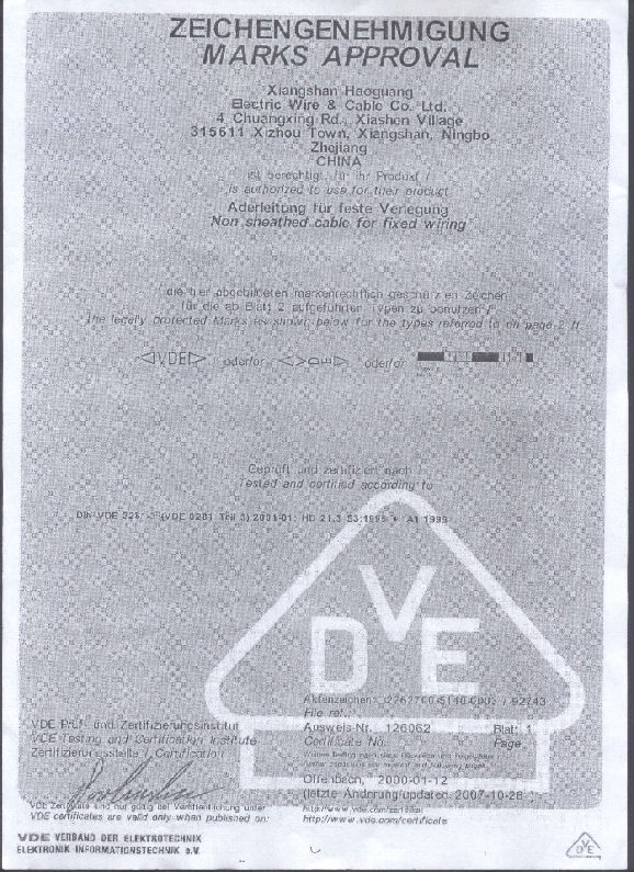 VDE certificate for wire