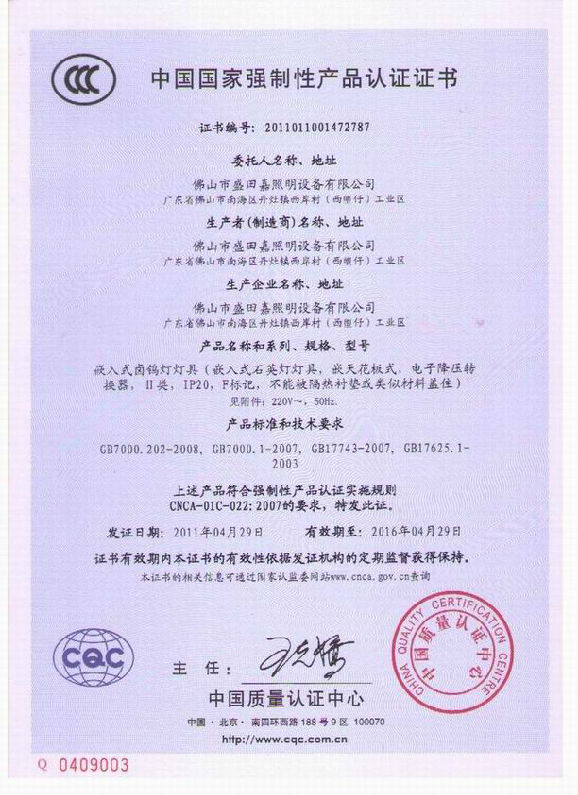 CERTIFICATE FOR CHINA COMPULSORY PRODUCT CERTIFICATION