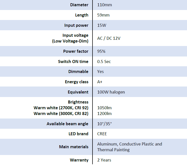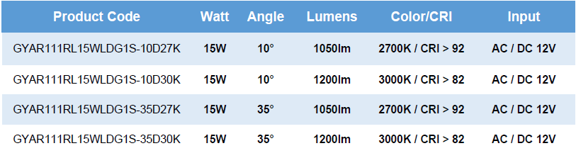 The new Reality AR111-G1S is an 15W LED lighting based on our AR111-G1 but much more powerful than the original 12W. It is dimmable same as halogen and can also be compatible with many dimmer in the market, a perfect choice to replace the old halogen. We used a CREE LED to bring out more Lumen output which is equivalent to a 100W halogen. With the aluminum reflector and our patented Anti-Glare technology, you won't see the LED directly.