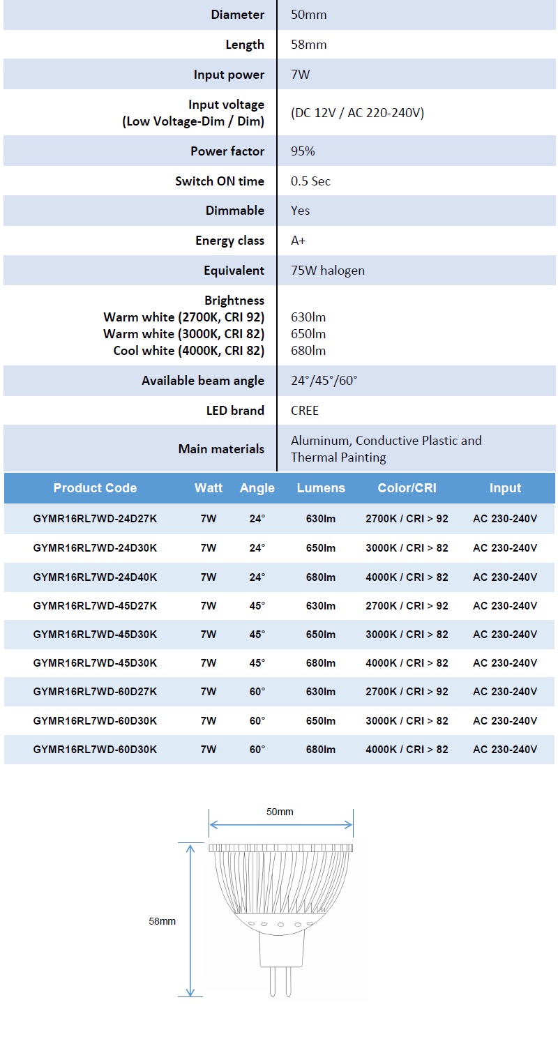 Reality MR16-7W is a 7W LED lighting source witch is dimmable same as halogen and can also compatible with many dimmer in the market. This is a perfect solution to replace your old halogen.