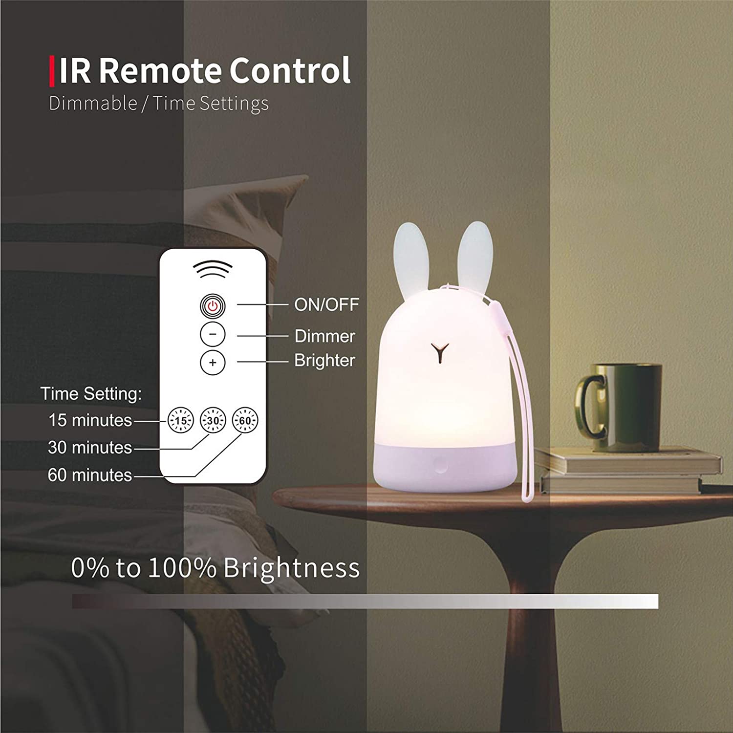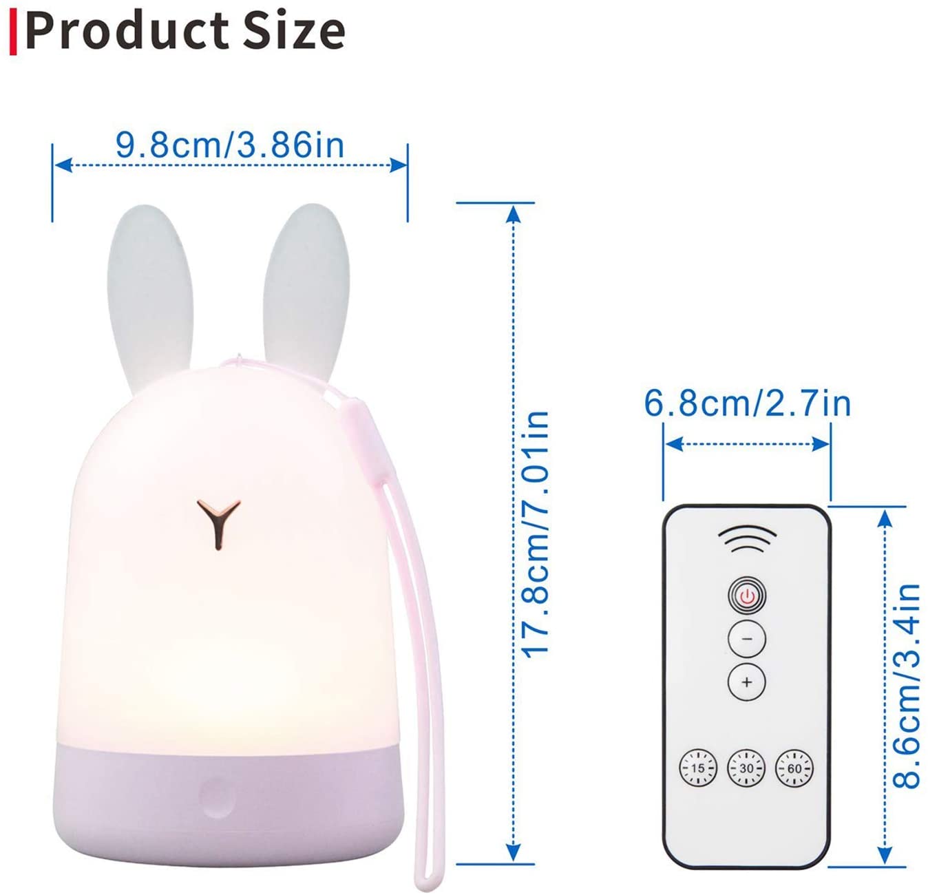 • 【Gifts Ideas For Kids and Moms & Safe Atmosphere The LED night light has calming , warm white glow, and stepless adjustable brightness. Its gentle color and brightness options help newborns and children to fall asleep. The cute bunny night light is a great nursery light and the best companion for children, because it makes kids feel secure and helps them sleep well. For boys/girls, it will be a perfect birthday Gift. For moms, it will be a practical Baby Shower gift.