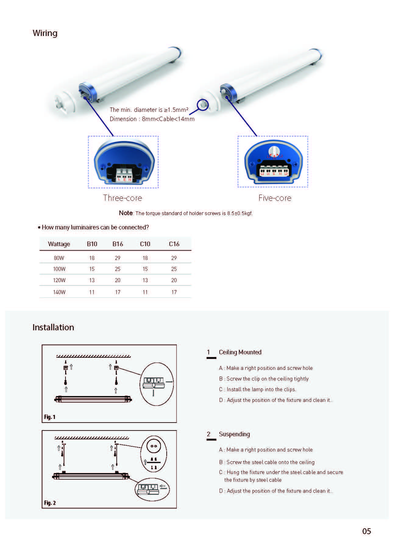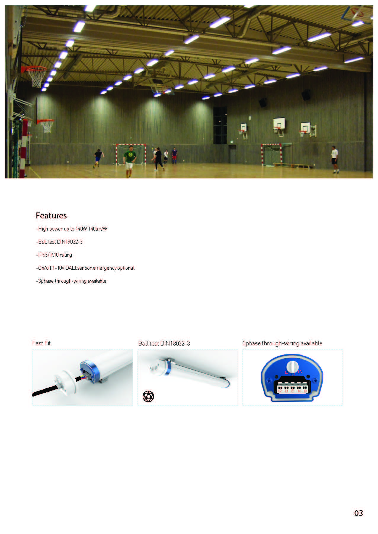 -High power up to 140W 140lm/W -Ball test DIN18032-3 -IP65/IK10 rating -On/off,1-10V,DALI,sensor,emergency optional -3phase through-wiring available