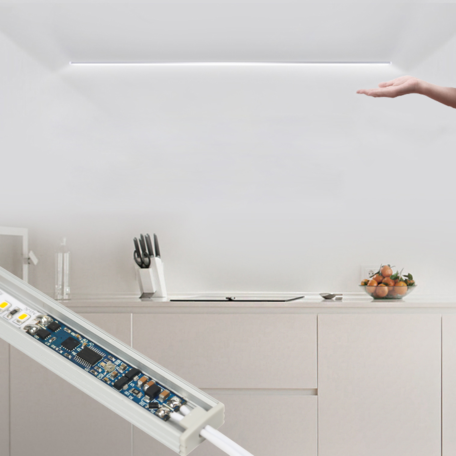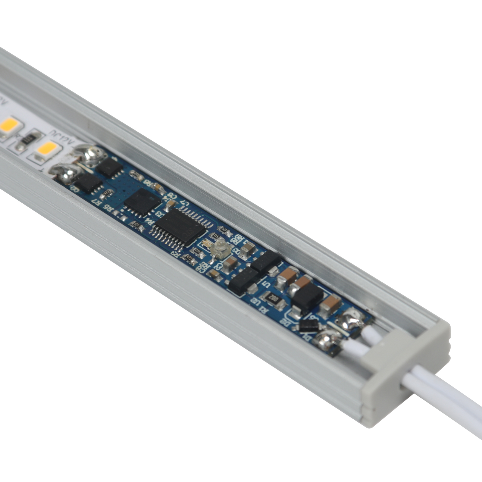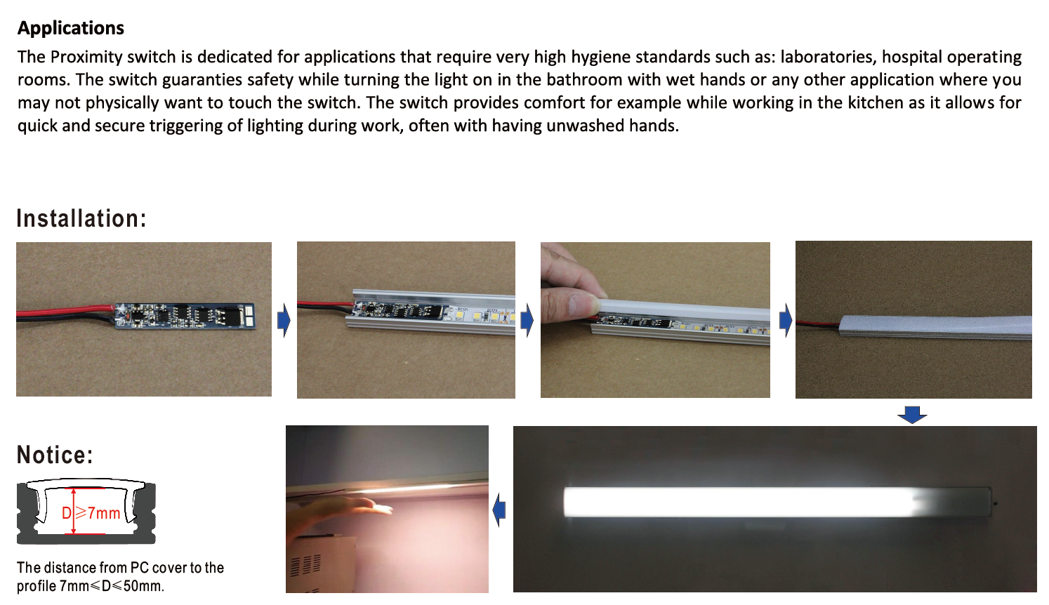 The Proximity Switch(motion sensor) is designed to be used in LED Aluminum profile. It is dedicated for switching LED lights “on” and “off” and “dimming” without touching the switch. This sensor switch is with 0V memory function. The Proximity switch operates based on an active reflective photocell. The cyclical device sends a string of infrared impulses and measures the strength of the reflected signal. When a hand is placed closer to the sensor the infrared impulses reflect from the hand and bounce back to the sensor. If the strength of the signal is maintained on the appropriate level, the output of the dimmer will reverse its state. The infrared light is emitted on a definite frequency as a result the dimmer is resistant to signals coming from other sources such as infrared remote controls, lamps or sunlight. The bottom of the Proximity switch is equipped with tape that allows secure mounting of the switch and additionally cools down the switch when mounted into an extrusion.