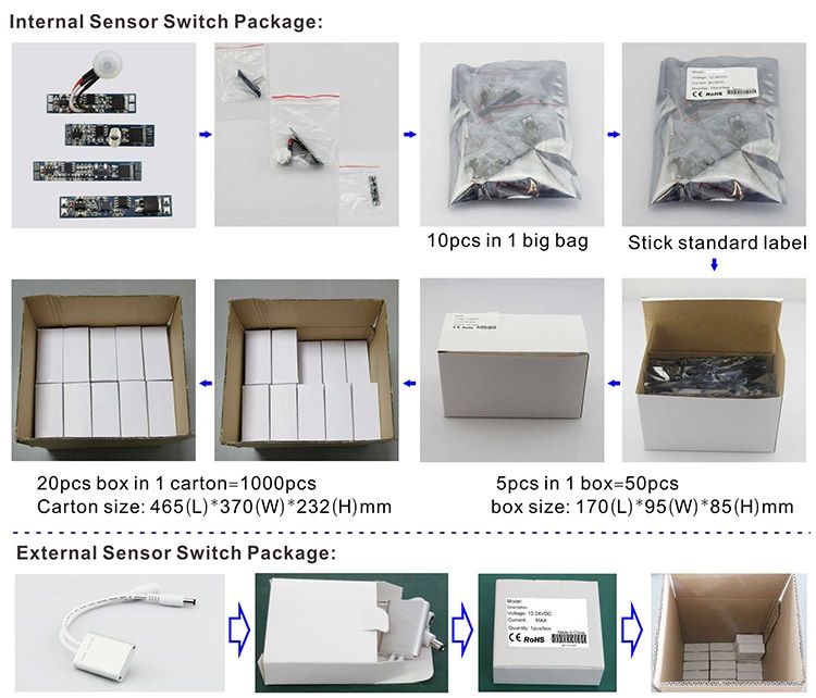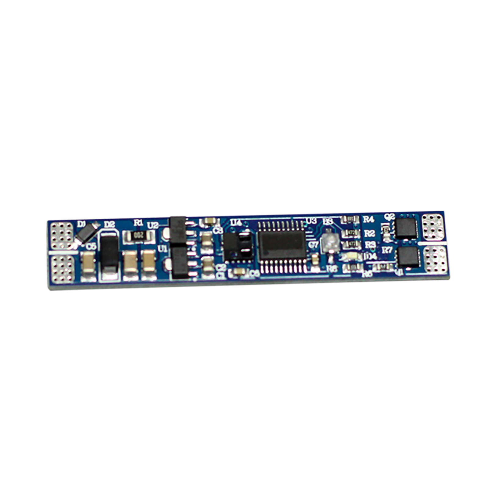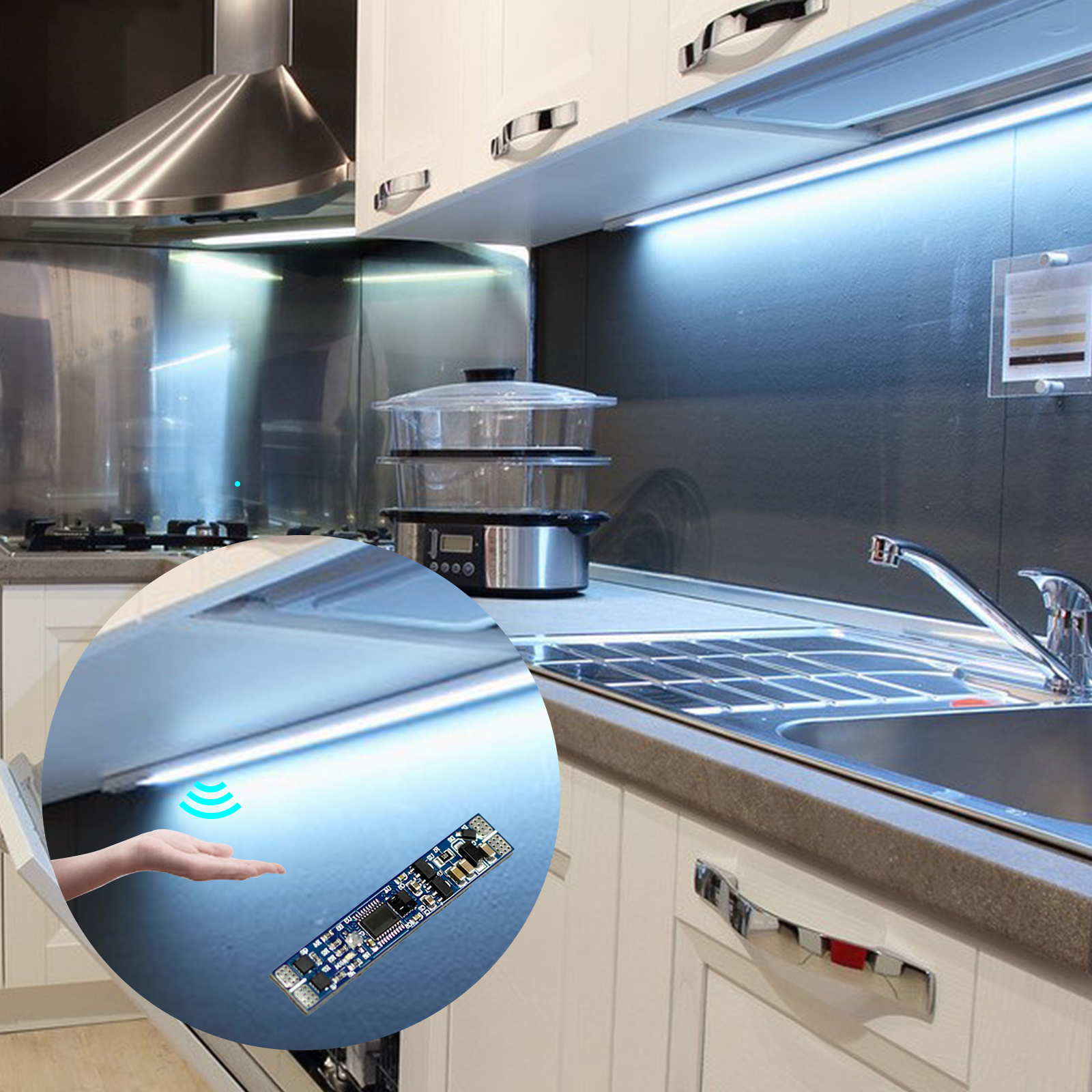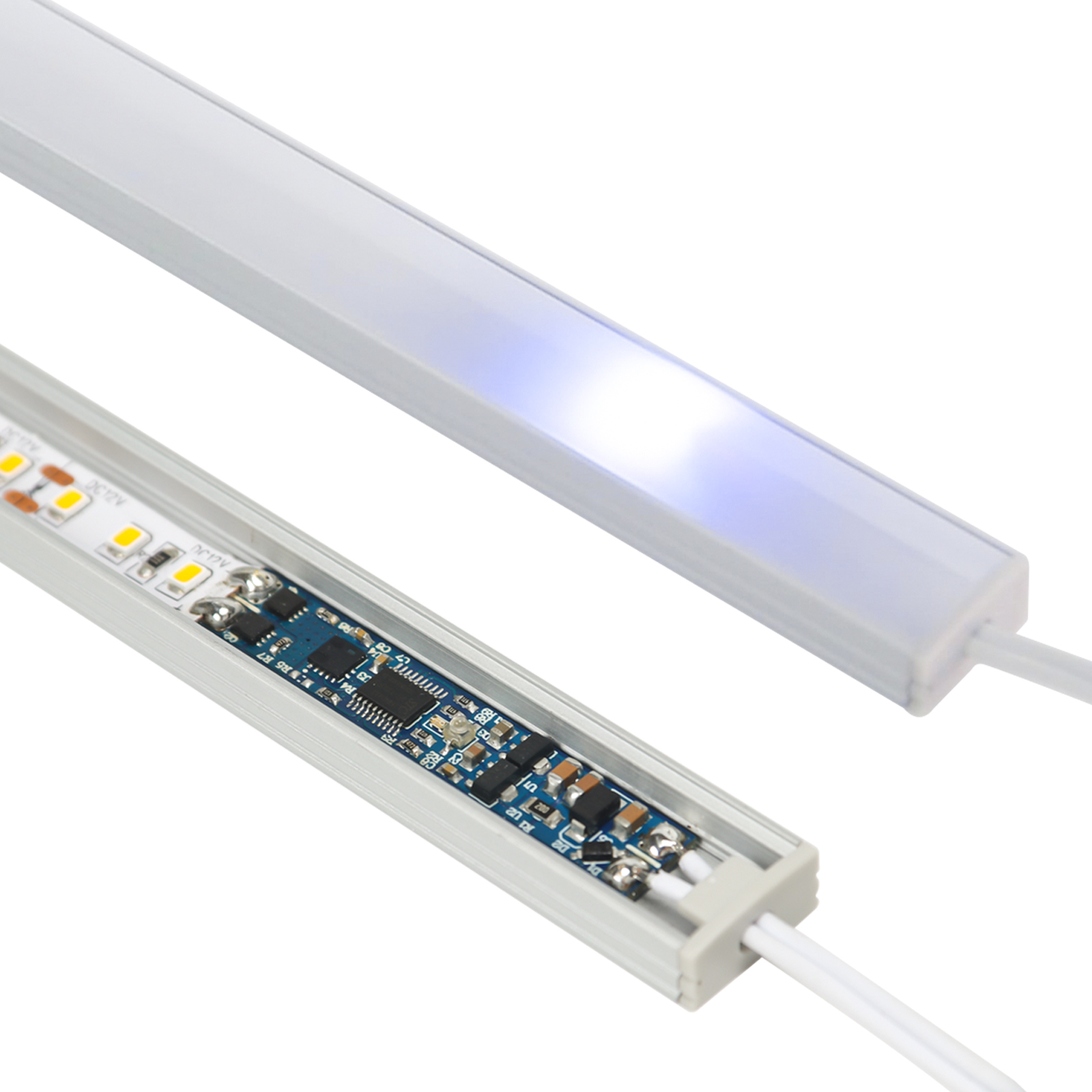 The Proximity Switch(motion sensor) is designed to be used in LED Aluminum profile. It is dedicated for switching LED lights “on” and “off” and “dimming” without touching the switch. This sensor switch is with 0V memory function. The Proximity switch operates based on an active reflective photocell. The cyclical device sends a string of infrared impulses and measures the strength of the reflected signal. When a hand is placed closer to the sensor the infrared impulses reflect from the hand and bounce back to the sensor. If the strength of the signal is maintained on the appropriate level, the output of the dimmer will reverse its state. The infrared light is emitted on a definite frequency as a result the dimmer is resistant to signals coming from other sources such as infrared remote controls, lamps or sunlight. The bottom of the Proximity switch is equipped with tape that allows secure mounting of the switch and additionally cools down the switch when mounted into an extrusion.