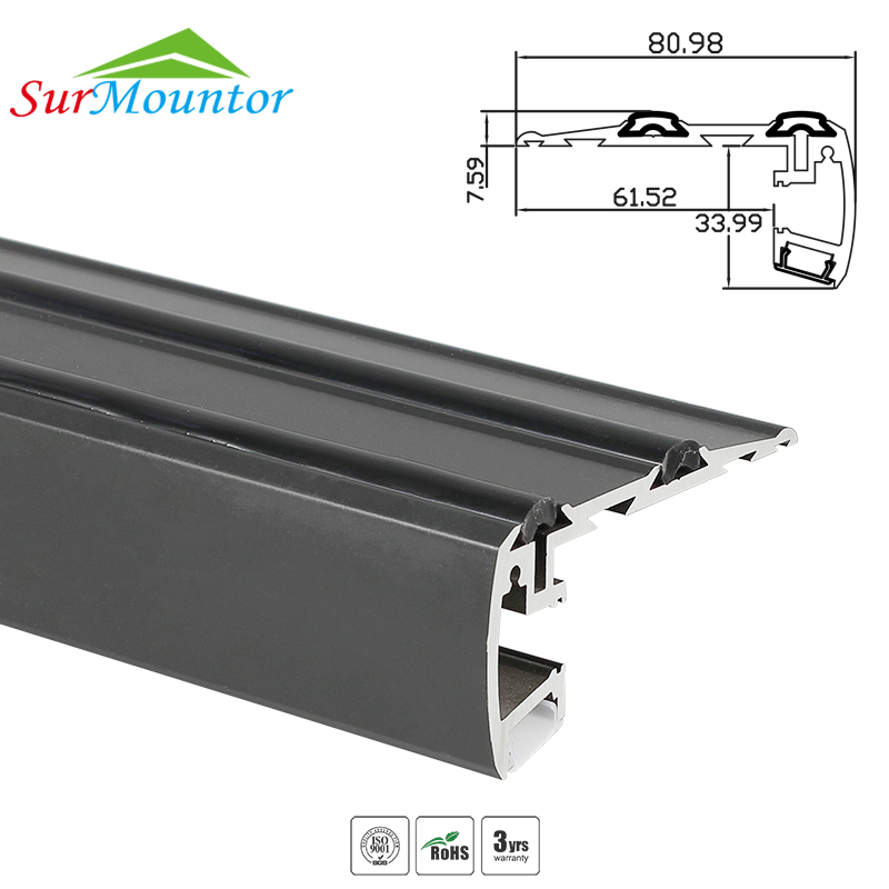 With 2 anti-slip rubbers upside, S002 stair aluminum profile is widely applied in cinema, theatre or night bar steps.
