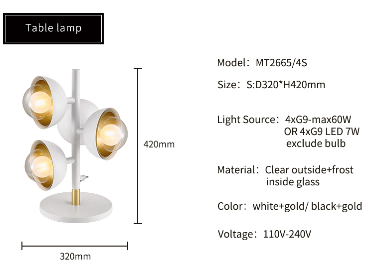 Power | 4xG9-max60W OR 4xG9 LED 7W exclude bulb |