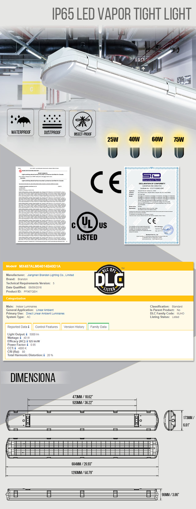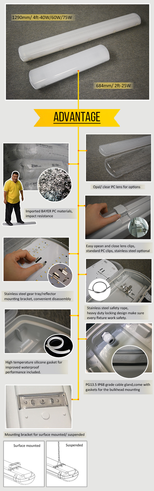 The Vapour Tight with new design has the same dependable quality as the existing Vapor Tight. The PC/UV unbreakable lens and case have the futuristic etched design, providing a brighter light output. Other special features include light weight aluminum board, enhanced heat resistant casing and tough stainless steel clips. It is IP65 rated and suitable for wet locations.
