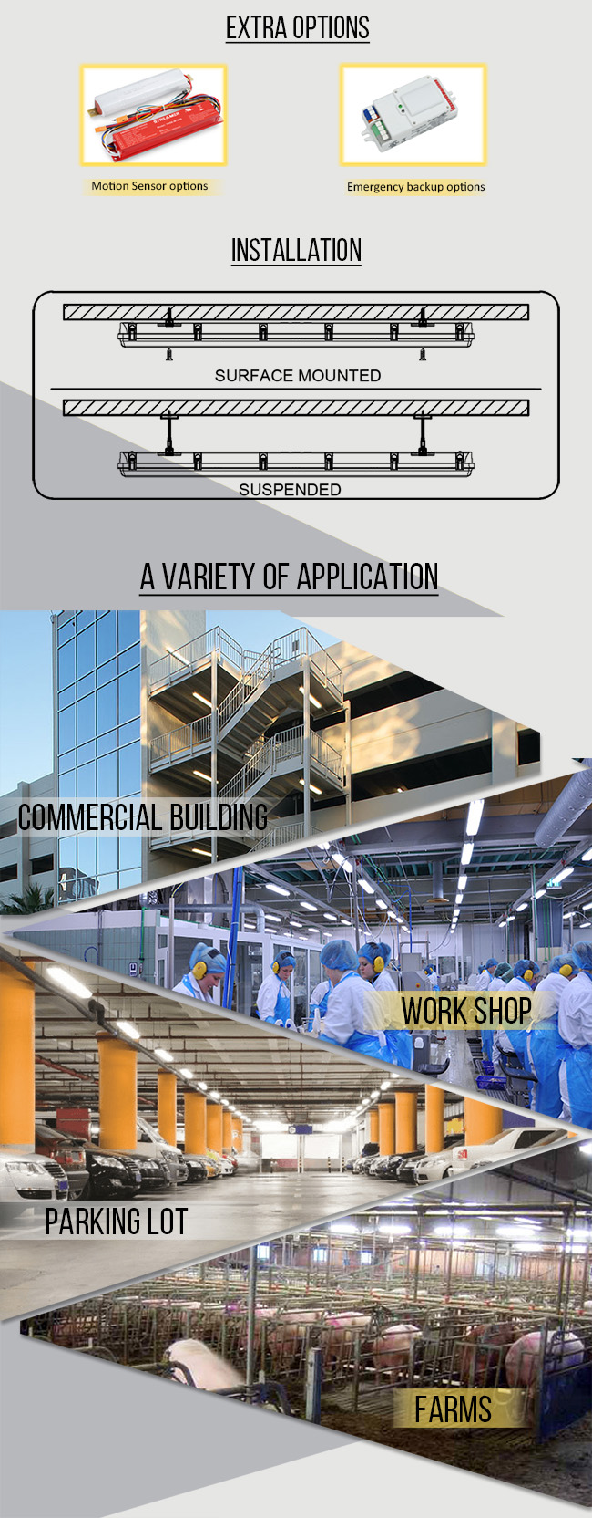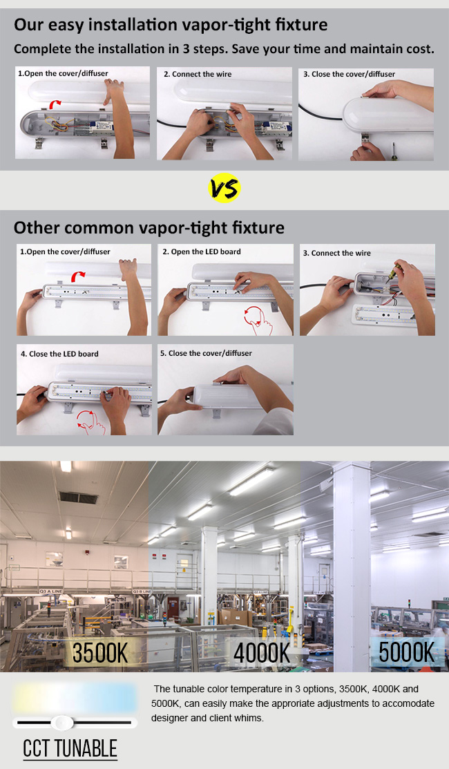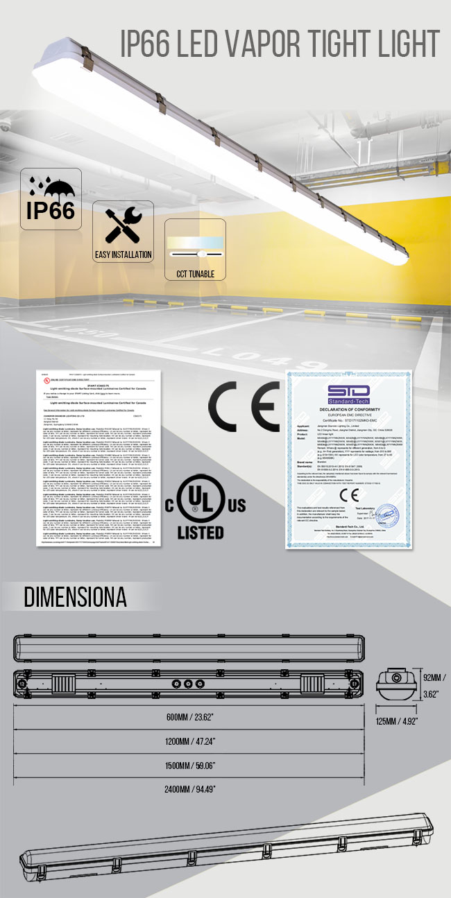 Our linear vapor tight is housed in polycarbonate siliconn perimeter gasket with brackets for mounting. Engineered for powerful lighting, the IP65-rated LED Vapor Tight Linear Fixtures are designed to replace flfluorescent strip fixtures and can be used in parking garage, corporate campus, education facility, storage facility, car washes, tunnels and stairwell lighting.