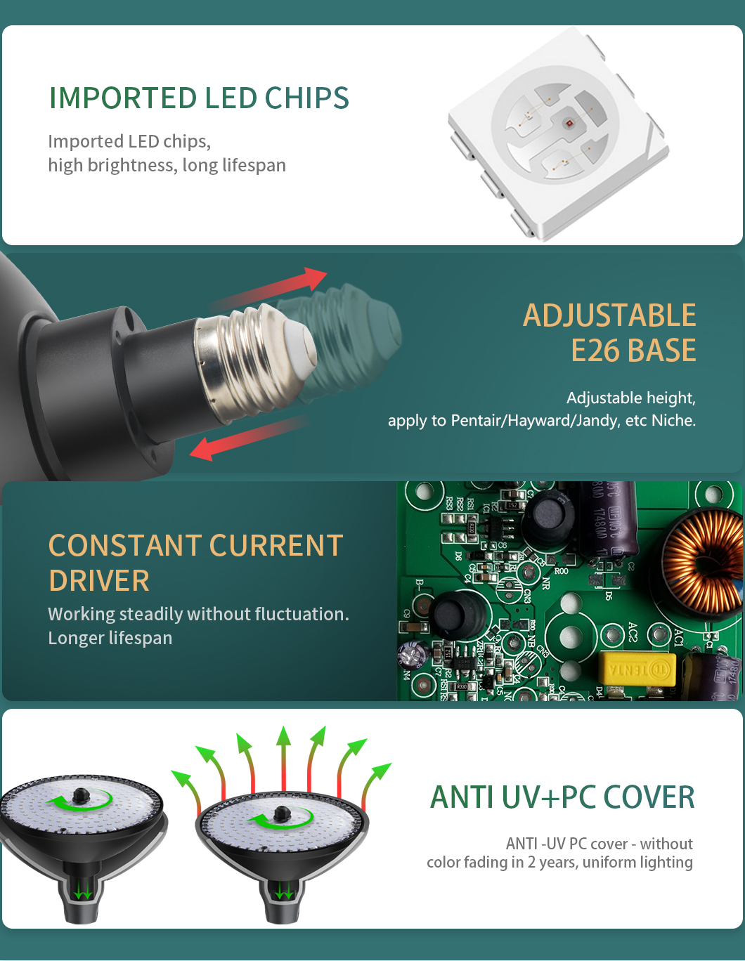 2.Adjustable height patented design, PAR56 bulb can perfectly match with the niches of Pentair, Jandy, Hayward, etc.