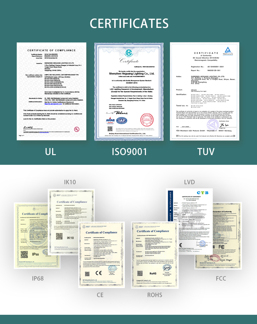 UL Certification(PAR56 Pool lights), CE, ROHS, FCC,EMC, LVD, IP68,VDE, ISO9001 certification