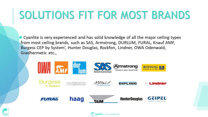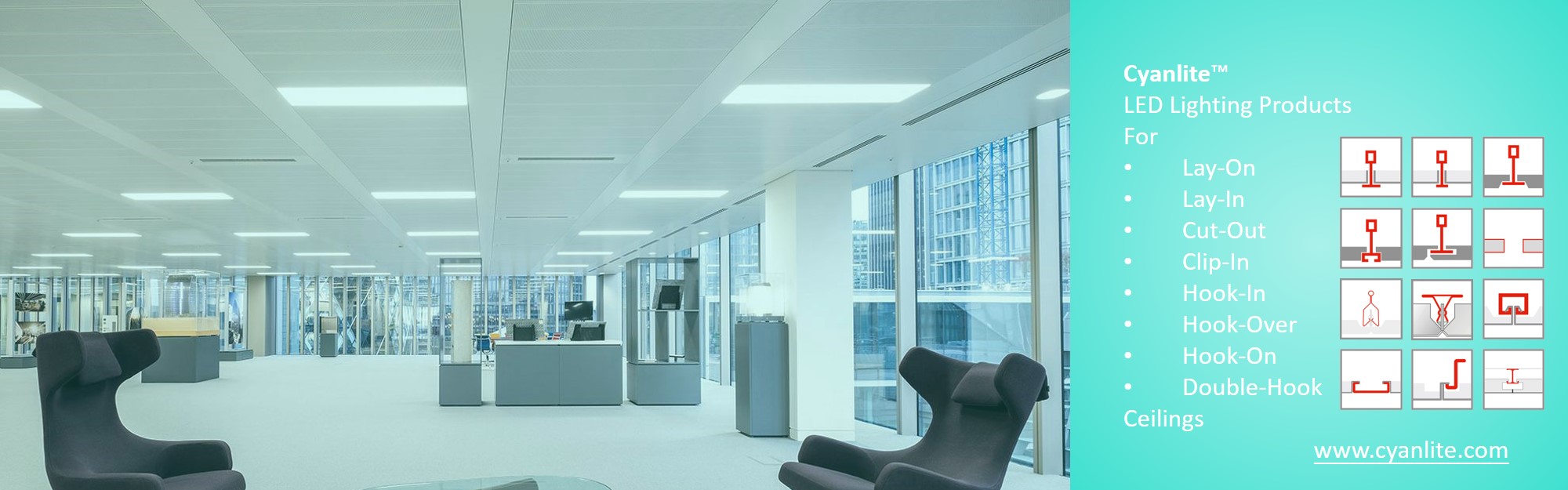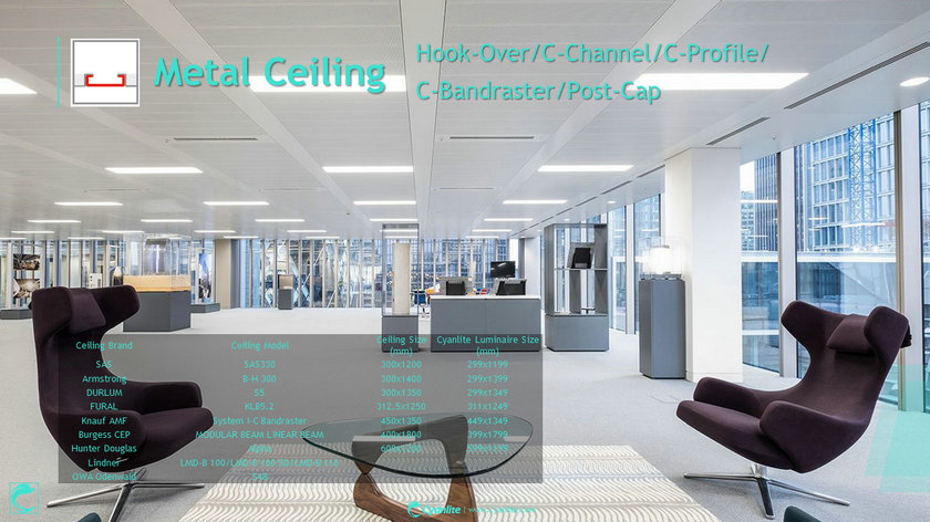 Cyanlite LED panel lights include professional lighting solutions for all kinds of ceiling systems, including the normal Lay-On ceiling(T15/T24 T-bar ceiling), as well as plasterboard ceiling and metal ceiling systems, such as Clip-In ceilings, Hook-Over ceilings, Hook-On ceilings, Hook-In ceilings etc., and suitable for the major global ceiling brands such as SAS, Armstrong, AMF, BURGESS, OWA, FURAL and so on.