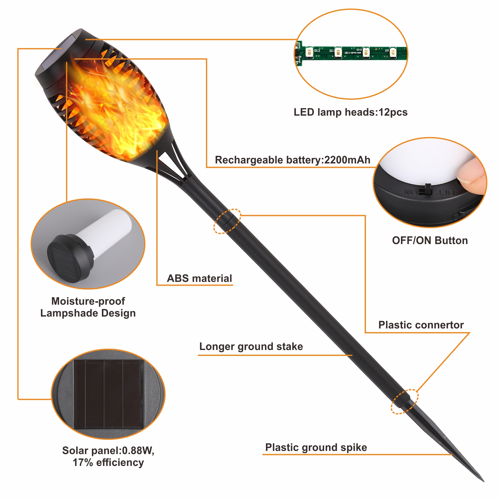 Just place the solar flame lights into your lawn, garden, a flower pot, bench, pathways. IP65 waterproof dancing flame solar torch light was built to withstand all kinds of weather all round the year.
