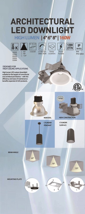 Liteharbor ALX-HVA Series has 3 sizes, respectively 4'', 6'', 8'' specification grade high output LED downlight capable of delivering over 13500 lumens and designed for ceiling heights from 20 to 60 feet.