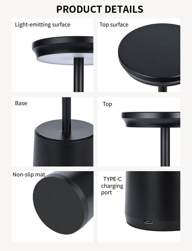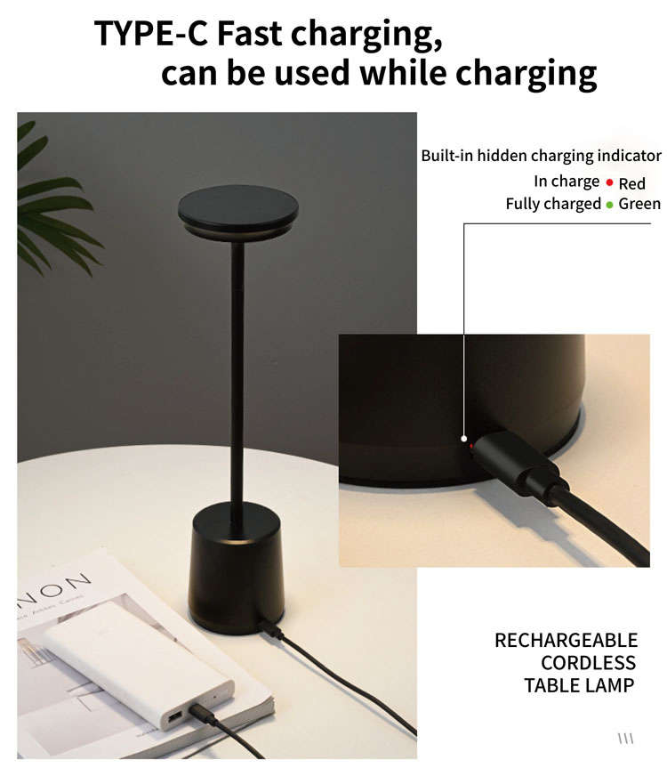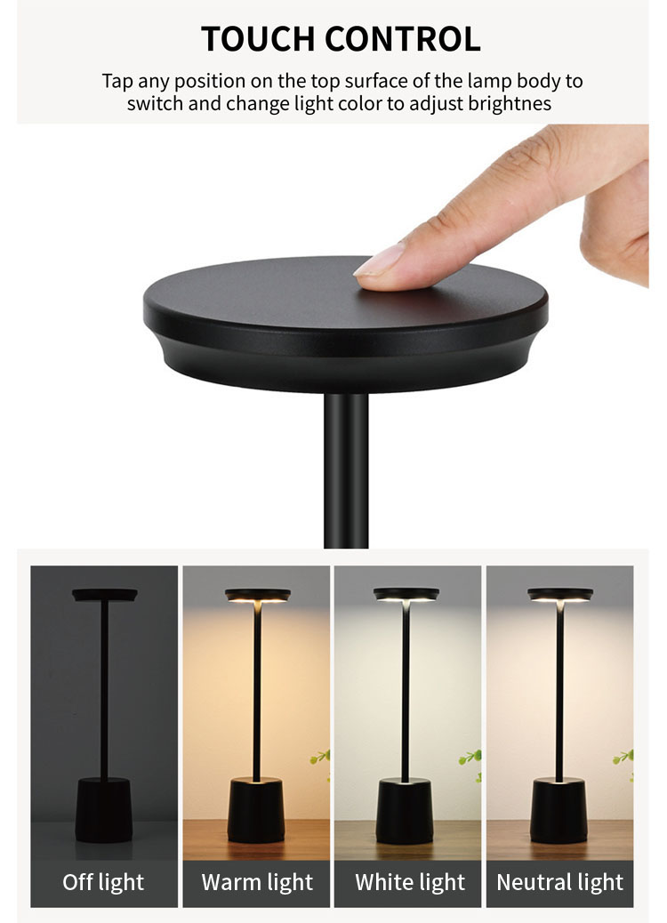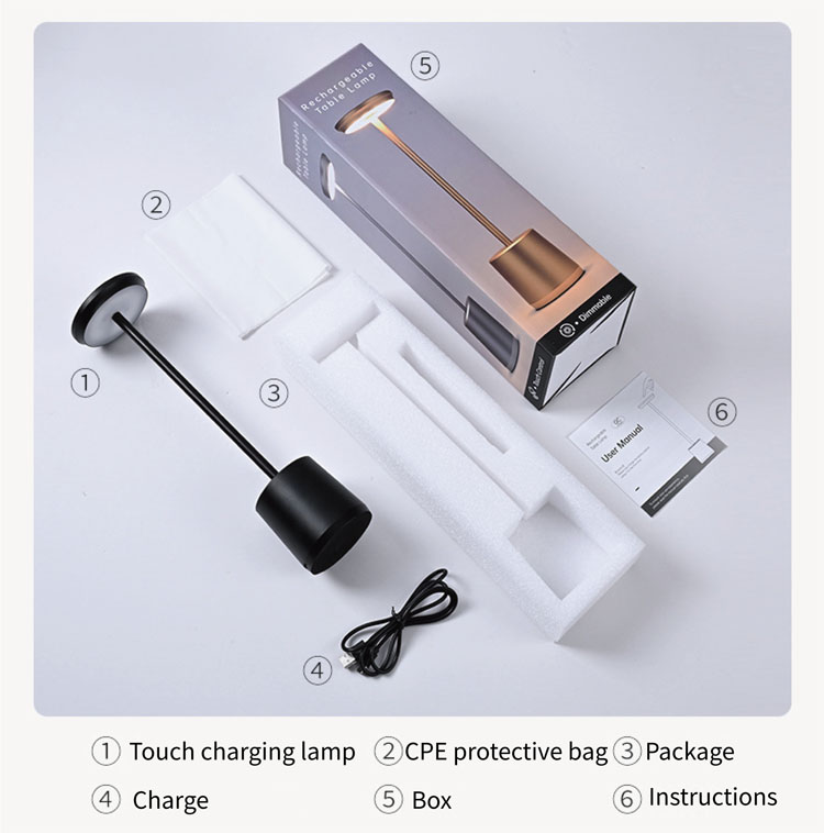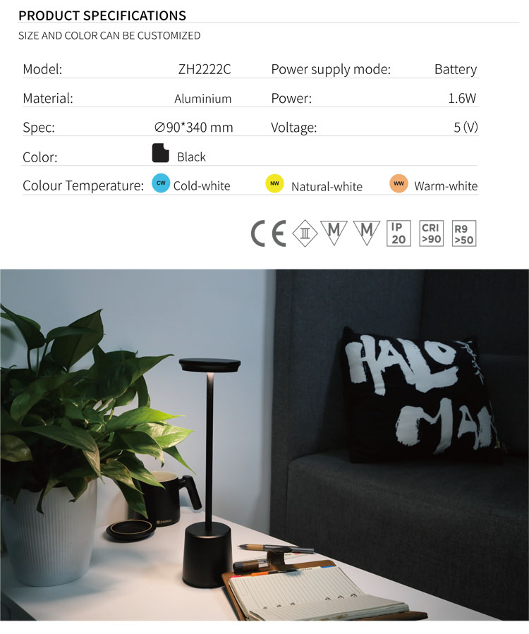 1. Product Title: Zhihui Creative Led Touch Rechargeable Portable Cordless Luxury Modern Table Lamps 2. Product Keywords: Table Lamps,Portable Cordless Table Lamp,Led Touch Lamp 3. Product Attributes: Color Temperature(CCT):2800K/3800K/4500K,Packing Dimension:400*115*115mm,Design Style:Minimalist,Light source model:2835,Light Source:LED,Free sample:Support,Support Dimmer:Yes,Warranty(Year):2-Year,Control Mode:Touch Control,Place of Origin:Guangdong, China,product name:LED induction night light,Working Temperature(℃):-20 - 50,Full battery usage time:8 hours,Material:Metal Aluminum,PCs/ Ctn:25,Lighting solutions service:Light drawing and design, Lighting and circuitry design,Lamp Luminous Efficiency(lm/w):60,Power Supply:Battery,DC,LED,Lifespan (hours):50000,Packing list:light+TYPE-C charging cable,Lamp Luminous Flux(lm):102W,Power:1.6w,product type:LED small table lamp,Model Number:ZH2222C,Input Voltage(V):2.6-5V,DIY:Yes,Shade material:Aluminum,Brand Name:Zhihui,USB cable length:100cm,Application:Bedroom,Living room,Bar,Restaurant,Luminous mode:Down,Full charge:4400mA,Shade Shape:Round,Product Weight(kg):0.5,Product Dimension:90*340mm,Working Time (hours):8h,Lamp Sizes:Mini,Lamp Body Material:Aluminum,Color Rendering Index(Ra):80 4. Product Features: Touch control, Nordic style, simple design, restaurant atmosphere 5. Product Expanded Keywords: table lamps,desk lamp,bedside lamps |