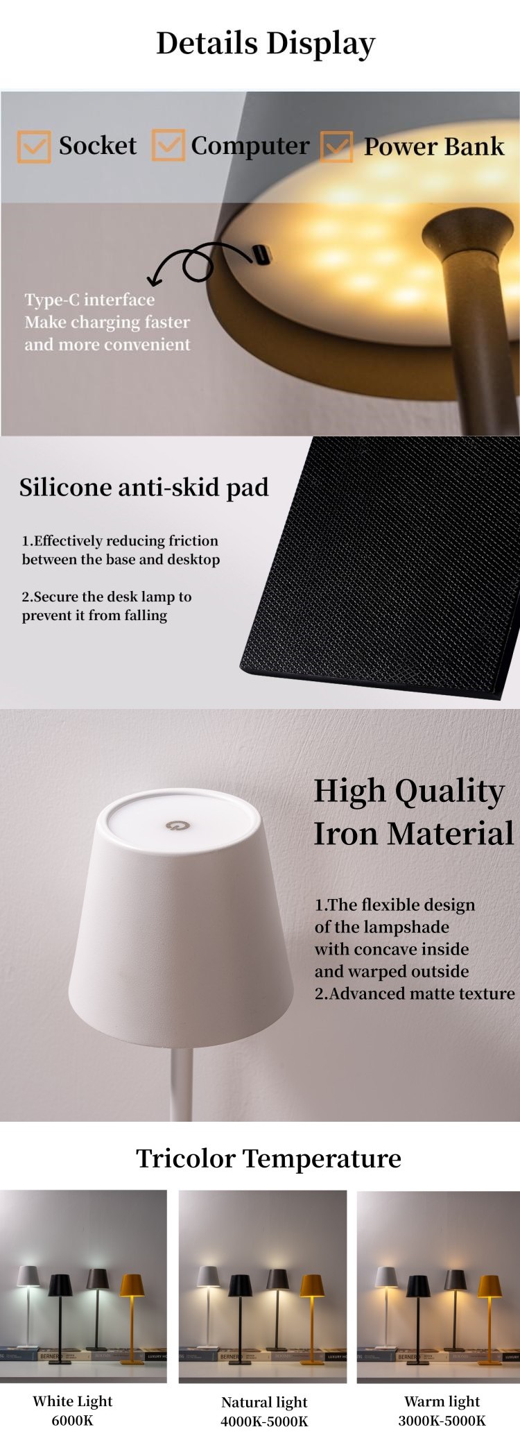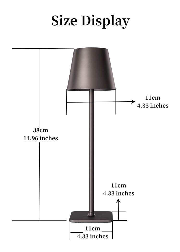 【Portable Battery Desk Lamp】Built-in 4000MA rechargeable battery, fully charged can be used for 8-40 hours (can also be used while charging), has passed safety certification, this perfect desk lamp will easily update your space, with its built-in Batteries, you can place the light anywhere. 【Battery Powered Desk Lamp】Battery powered, use USB Type-C to charge, charging time 3-4 hours, autonomy 8 to 40 hours depending on the selected intensity. 【3 Color Stepless Dimming】Color temperature: warm white light, warm light, white light, stepless dimming (5%-100%); range: 3000K-6000K; touch switch control, switch light mode by clicking, long press control Brightness of lights. Allows you to easily change the brightness, perfect blend of modern and chic charm, suitable for outdoor camping/family gathering/dinner lighting, create a romantic night for you. 【Metal Table Lamp】It adopts high-quality wrought iron lamp body + acrylic light-transmitting lampshade material, and has been treated with matte coating, which is scratch-resistant and anti-corrosion. Anti-skid design at the bottom, using soft silicone to prevent the bottom from slipping. 【Minimalist Design】 Portable table lamp, simple shape, elegant round design, smooth and slender metal arm and matte shade, make it look stylish and minimalist, perfect for self use or gift for family and friends. If you have any questions after receiving the package, please feel free to contact us. We are happy to help and give you a satisfactory solution. |