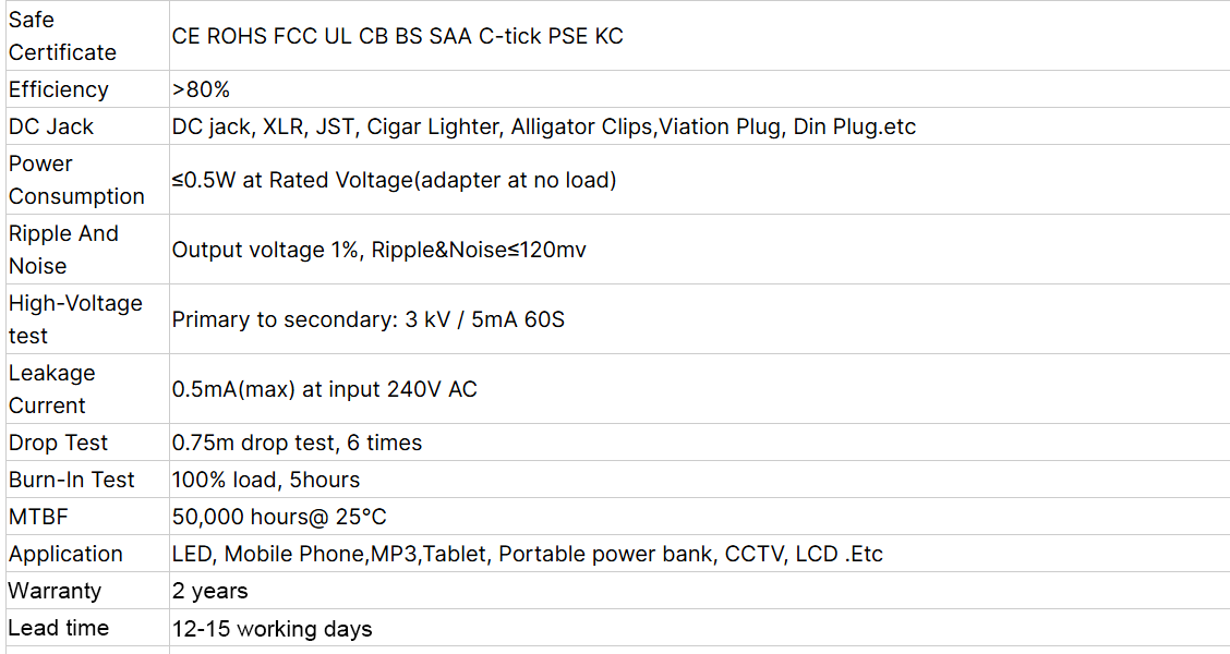 Feature highlights:This 12V 24V switching power supply adapter, with CE, FCC, SAA, CB, GS, KC, and PSE certifications, ensures compliance with global safety standards and offers market access. It features universal input voltage (100-240V), multiple output options, and comprehensive protection (over-load, over-voltage, short circuit). With a high efficiency of >80%, low power consumption (≤0.5W at no load), and a 2-year warranty, it is ideal for LED, mobile devices, CCTV, and more.