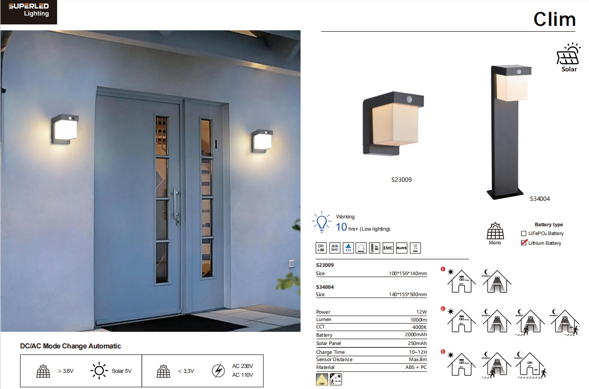 Clim solar wall/lawn light Replaceable Battery with PIR