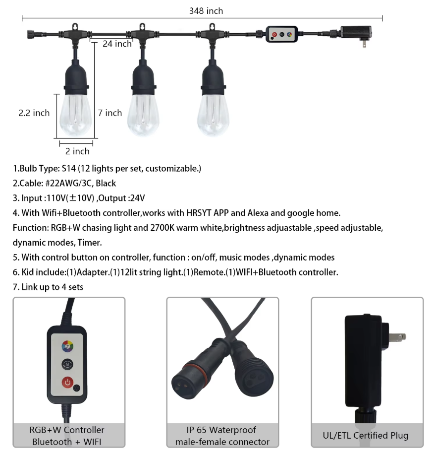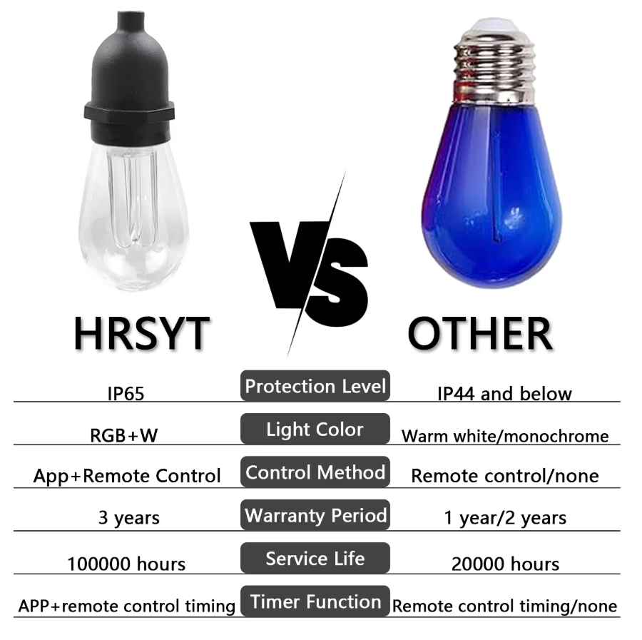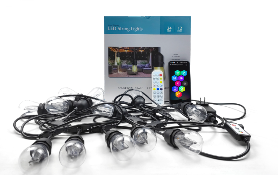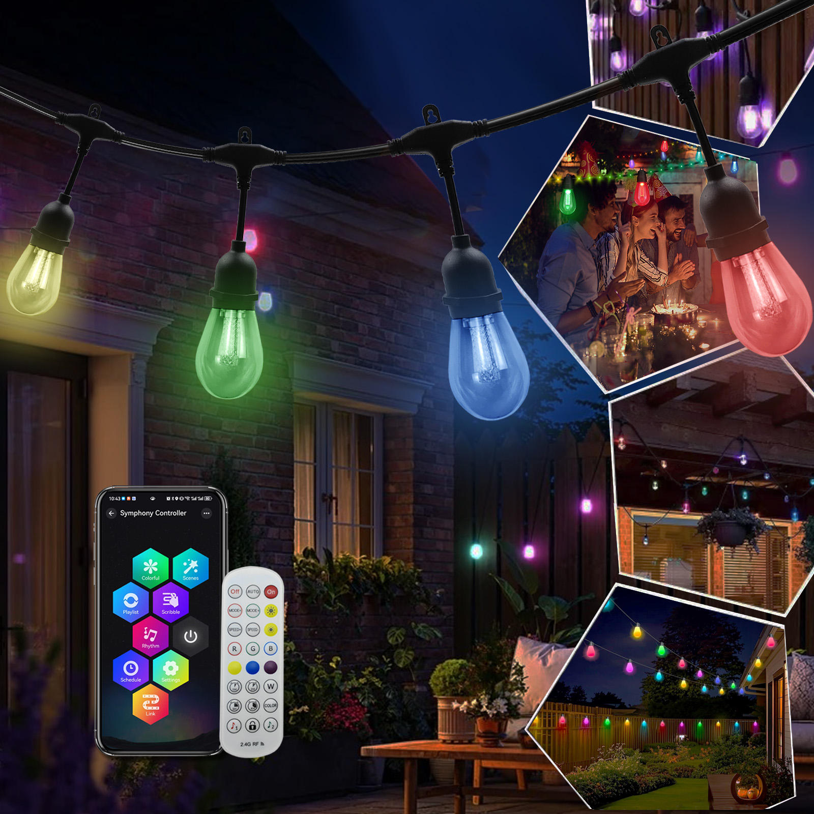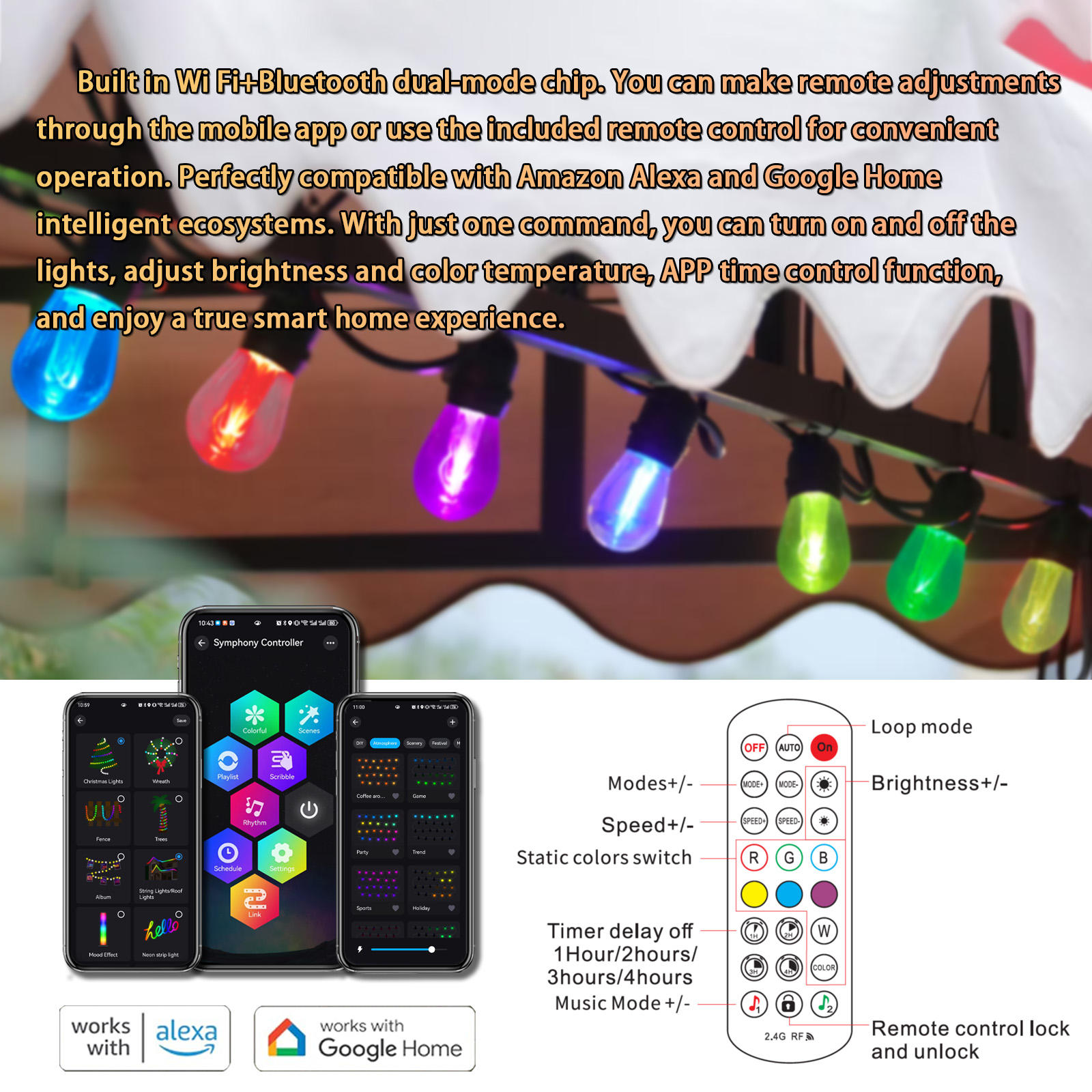 HRSYT RC and APP Control Hanging LED Patio Lights RGBW Bulb String Light DC24V IP65 Waterproof for Christmas or Holiday Decorations