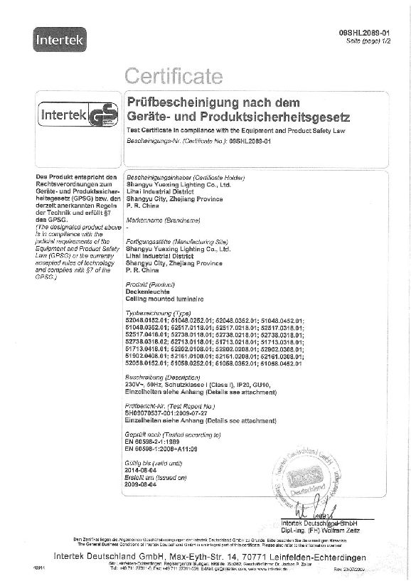GS certificate for indoor lighting fixture-G9