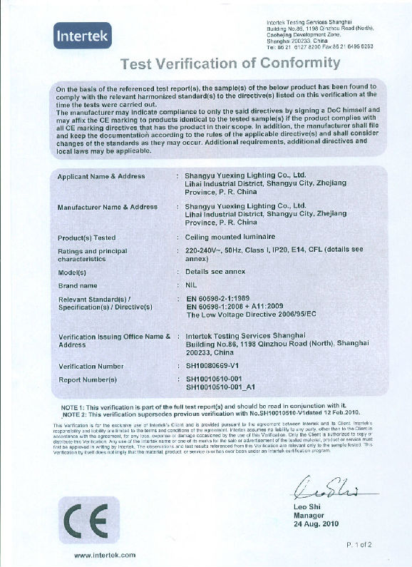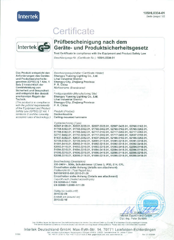 GS certificate for indoor lighting fixture-E14