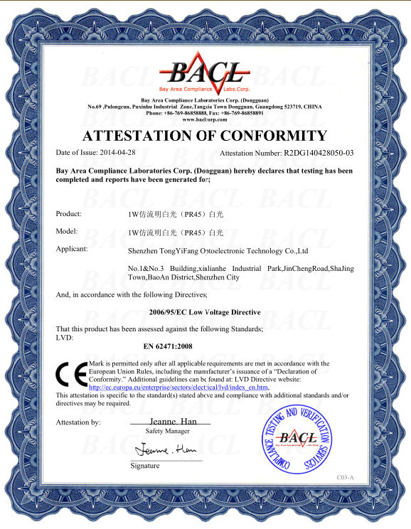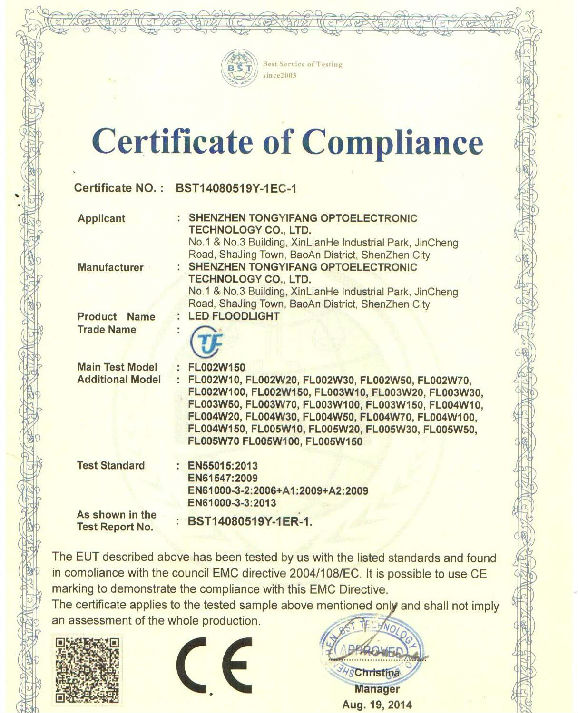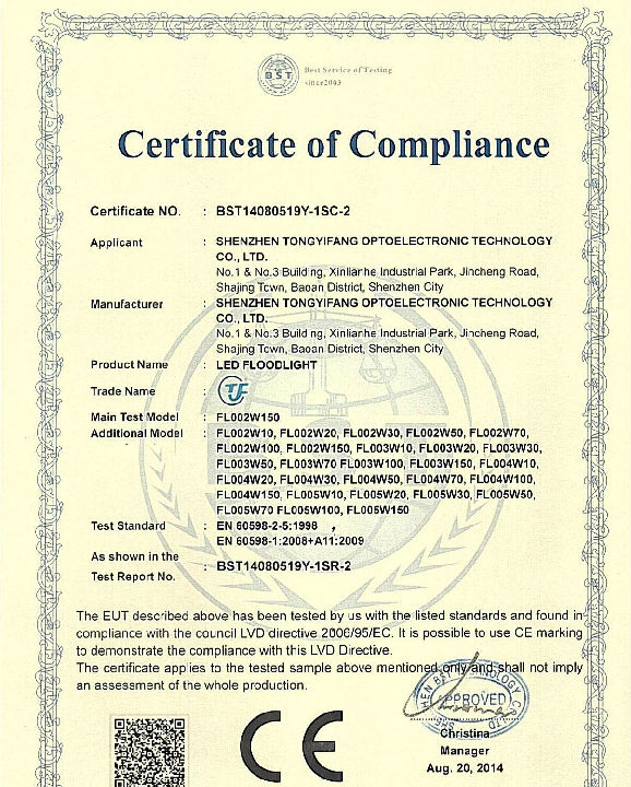 CE LVD Certificate of TYF Flood Light FL002-005