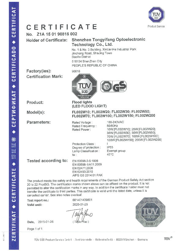 TUV-GS Certificate of TYF LED Flood Light FL002