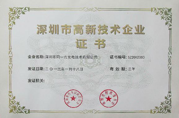 TYF Shenzhen High-tech Enterprise Certificate