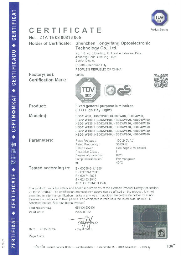 TUV-GS Certificate of TYF LED High Bay
