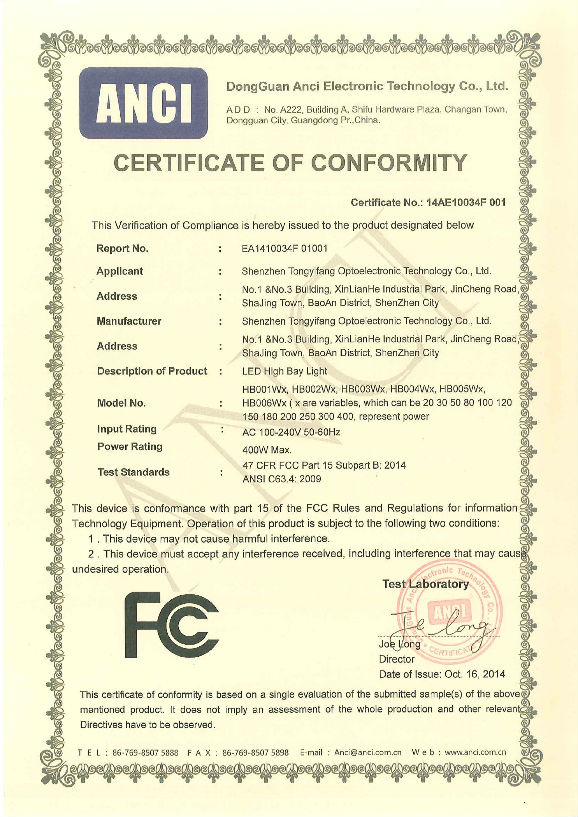 FCC Certificate of TYF LED High Bay
