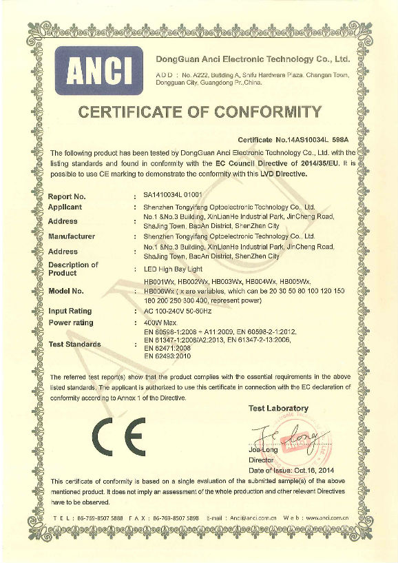 CE LVD Certificate of TYF High Bay