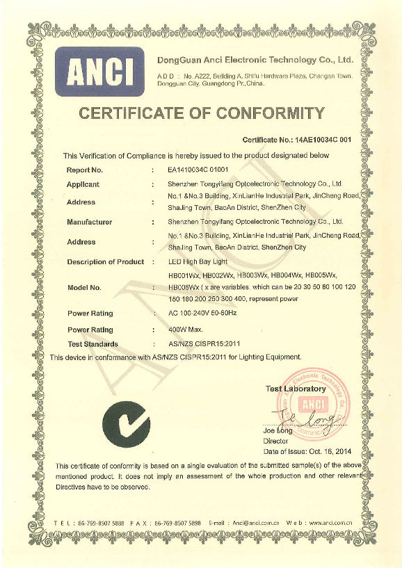 C-tick Certificate of TYF High Bay