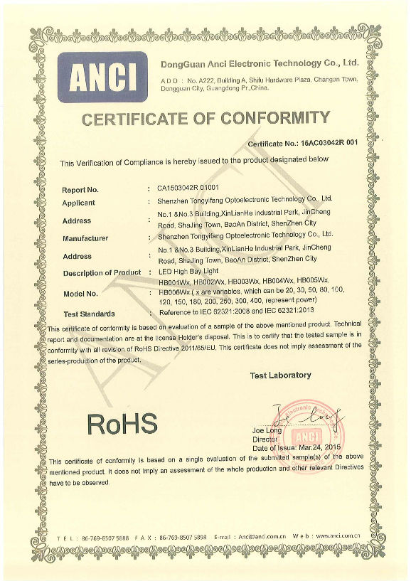 ROHS Certificate of TYF LED High Bay