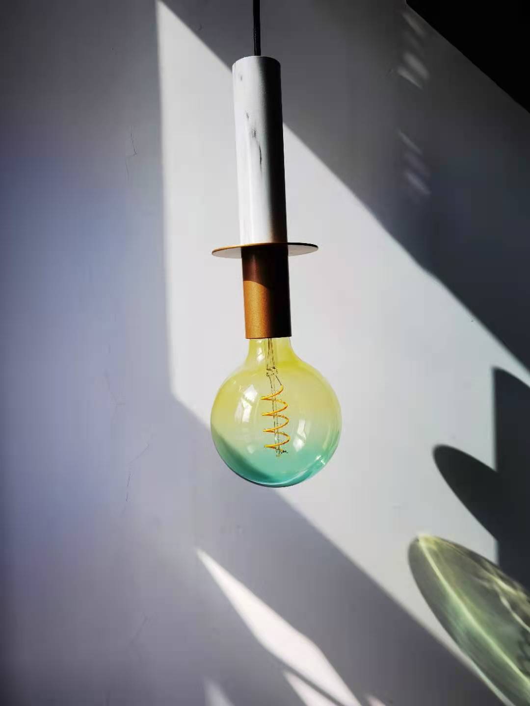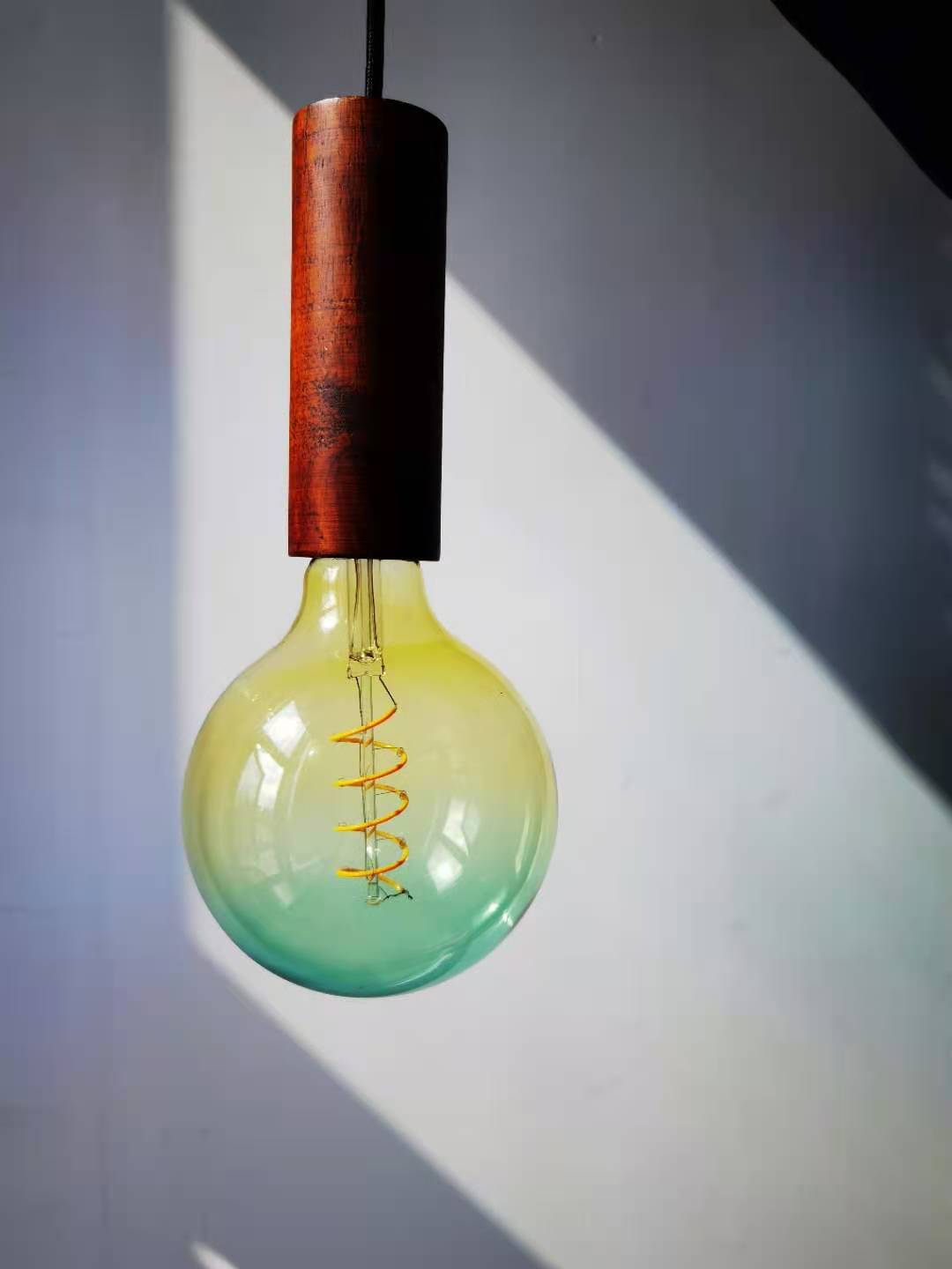 A beautiful and fun oval shaped glass LED light bulb in a gradient moonstone yellow and green finish. This stylish bulb is it's own centre piece, sure to draw the eye in any interior. Bring style and intrigue to your interior. Being LED lit means it's energy efficient using only 5 watts but providing around 250 lumens, it is also suitable for use on a dimmer switch. This would look great in a restaurant or bar and makes enough of a statement on it's own that it acts as its own lamp shade. The bare bulb look at its best.
